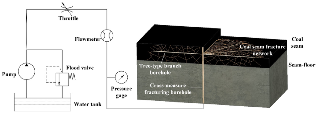 The entire branched array system can be divided into a tree-type borehole generating system and hydraulic fracturing system. The borehole generating system includes, but is not limited to, the drill rig, drill pipe, pressing device, steering device, and self-advanced drilling systems [21]. The hydraulic fracturing system includes, but is not limited to, a pressurizing device, pressure and flow control systems and a hole-sealing device (Figure 2).