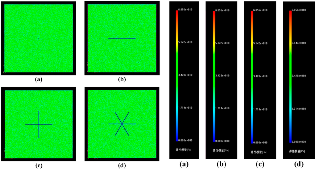 To reduce the influence of the size effect on fracturing, the four models were each set as squares with side lengths of 100 m, divided into 500 × 500 = 250,000 cells, and basic mechanical parameters of the models are shown in Table 1. The zero-branched model (Figure 3) has an excavation circle of 0.4 m diameter in the middle of the grid as a pressure borehole. The two-, four- and six-branched models (Figure 3) have, respectively, excavations of combinations of one, two and three rectangles in the middle of the grid where each rectangle is 40 m × 0.4 m. The combinations are regarded as two, four and six multiples of 20-m-long branched boreholes, respectively.
