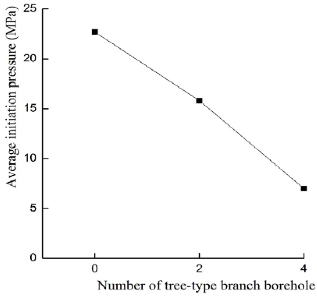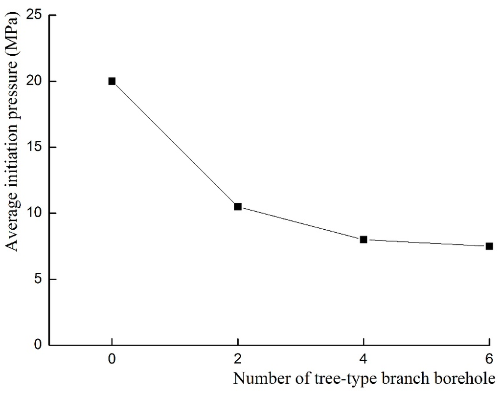 - Tree-type, branched borehole arrays reduce initiation pressure required for hydraulic fracturing. With an increase in the number of branches in the borehole, there is a measurable decrease in the initiation pressure. The model with four branches reduced the initiation pressure by 69%.
