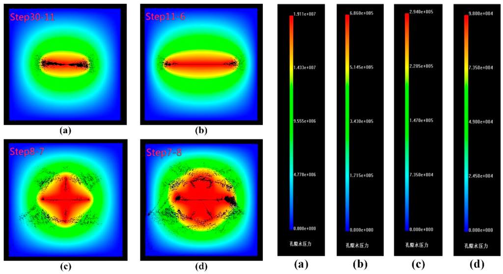 Throughout the fracturing process, the focus is on crack initiation and extension and thus, considering the large size of the numerical model, the large number of elements meshing and the finite computing power, the four different model forms are regarded as plane strain models, and are cut in the horizontal plane. Taking into account the need for numerical analysis, the horizontal stress is applied to the left, right and upper sides of the model, while the underside of the model is supported by simple constraints. The horizontal stress of the left and right sides is 20 MPa, and the upper side is 10 MPa. The pore pressure boundaries and pressure boundaries are the model boundaries. The water injection pressure acts upon the border of the excavation area inside the model where the initial pressure (P0) is 5 MPa and incremental pressure (P) applied in steps (e.g., Step 1, Step 2, etc.) is 0.5 MPa.