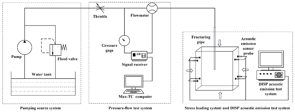 Water is used as the hydraulic fracturing fluid in the test and yellow pigment is added as a tracer to express the form and distribution of cracks that result. The initial flow rate is 200 mm3/s. During the test, a digital signal processing (DiSP) acoustic emission (AE) positioning system is used to monitor the initiation and extension of cracks in the specimen. The specimens are split open after the fracturing test for further observations.