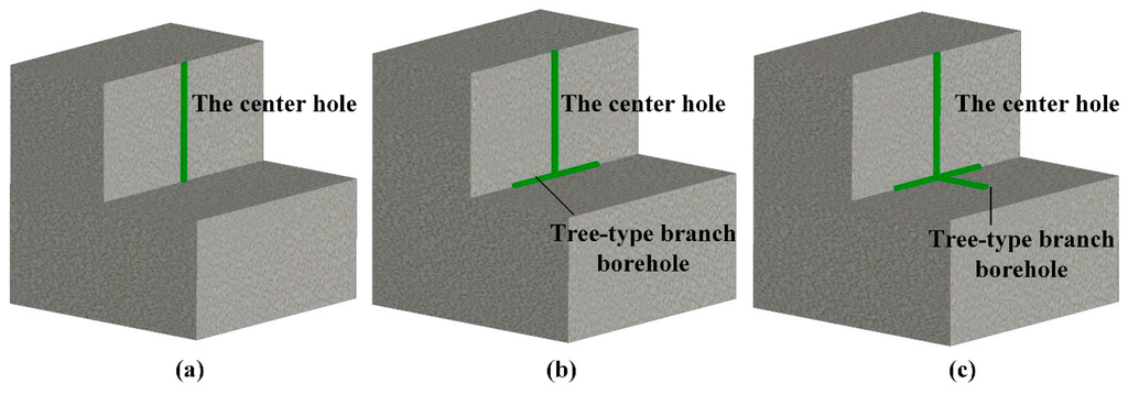 To study the effects of the branched hydraulic fracturing technology, and the impacts of different forms of the branching, a simplified example of conventional cross-measure hydraulic fracturing in China is used to compare and contrast. Cross-measure hydraulic fracturing has only one cross-measure fracturing borehole, which can be simplified to a “zero-branched” borehole model. The tree-type model, however, may have many branches, but will be simplified to a two-branched model, a four-branched model and a six-branched model.