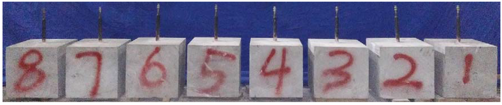 After erosion, the center hole and branched boreholes are cleaned, and then a high-strength AB glue cement is used to cement the fracturing pipe into the center hole [27]. The AB glue is used to cement rebar and concrete in the construction industry. The fracturing pipe is a seamless steel pipe with an inner diameter of 6 mm and outer diameter of 20 mm. To prevent the glue plugging the branched boreholes and fracturing pipe, medical tape was wound around the fracturing pipe 30 mm from the base of the pipe and the AB glue is then used to fill the remaining gap. Once the glue was set, the upper surfaces of the specimens were polished smooth. The completed specimens are shown in Figure 8. Basic mechanical parameters of the sandstone, determined using an MTS hydraulic servo system, the tensile strength is 4.1 MPa, the compressive strength is 56.9 MPa, the elasticity modulus is 36 GPa, and the Poisson’s ratio is 0.24.