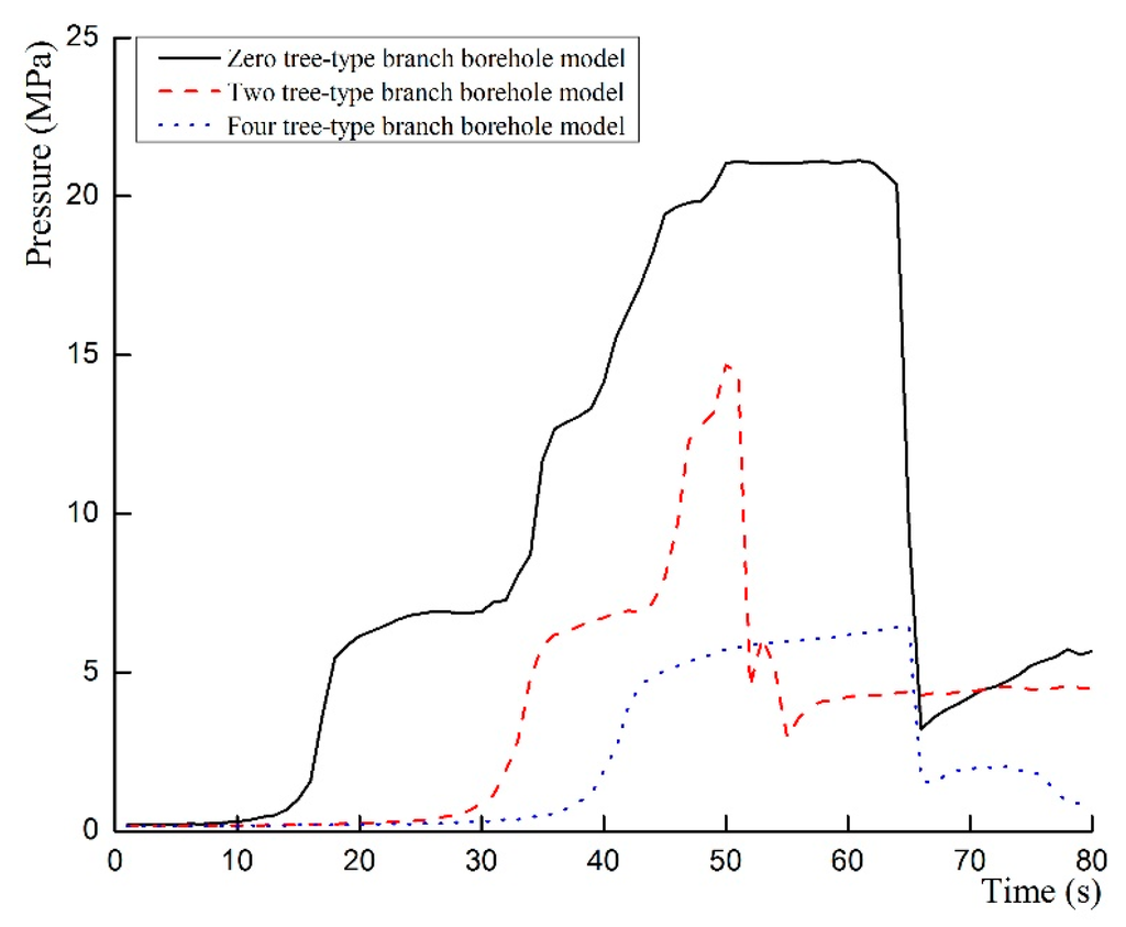 Time–pressure curves of different experimental models, illustrating the decrease in initiation pressure with increasing branches of the tree-type borehole array.