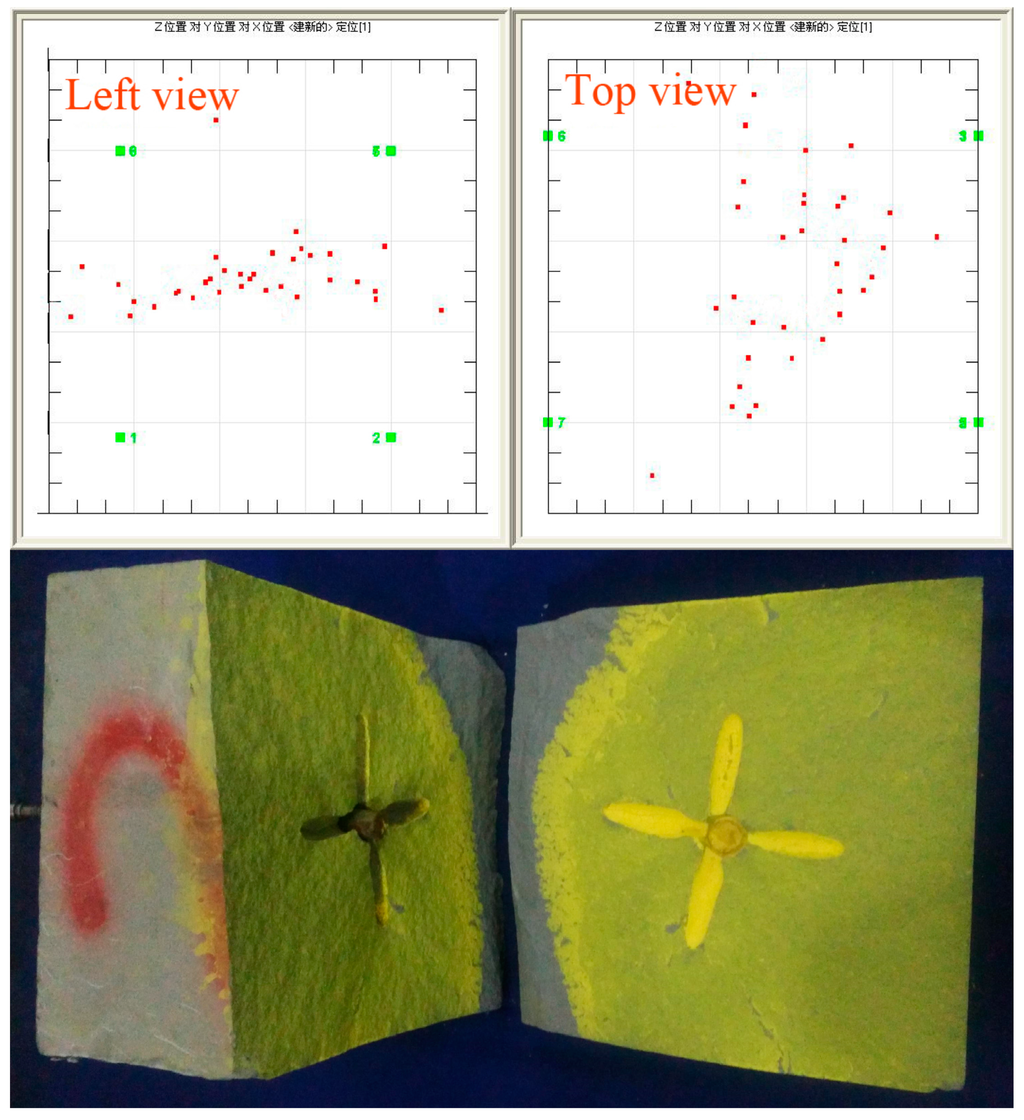 Comparison of AE events (left view and top view) in terms of spatial orientation, and fracture positions in the specimen.