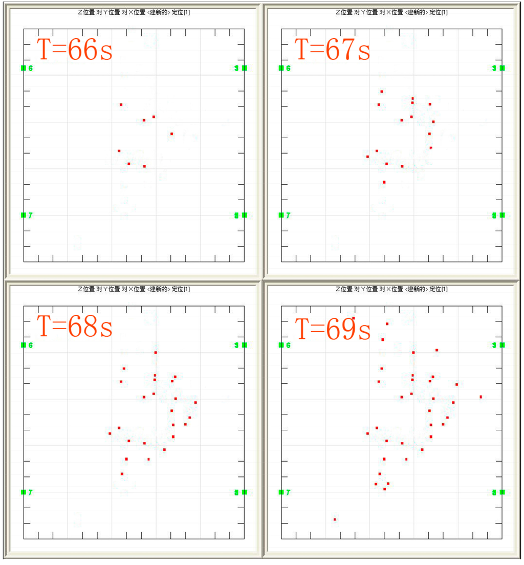 Top views of acoustic emission events in the No. 3 specimen at 66 s, 67 s, 68 s and 69 s.