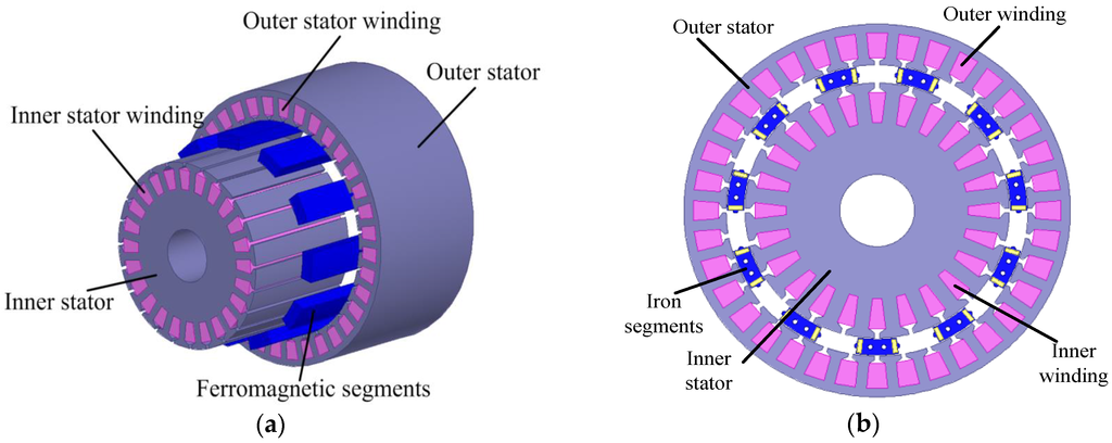 Structure of the DSFM motor with an iron segment rotor: (a) 3D model; and (b) 2D model.