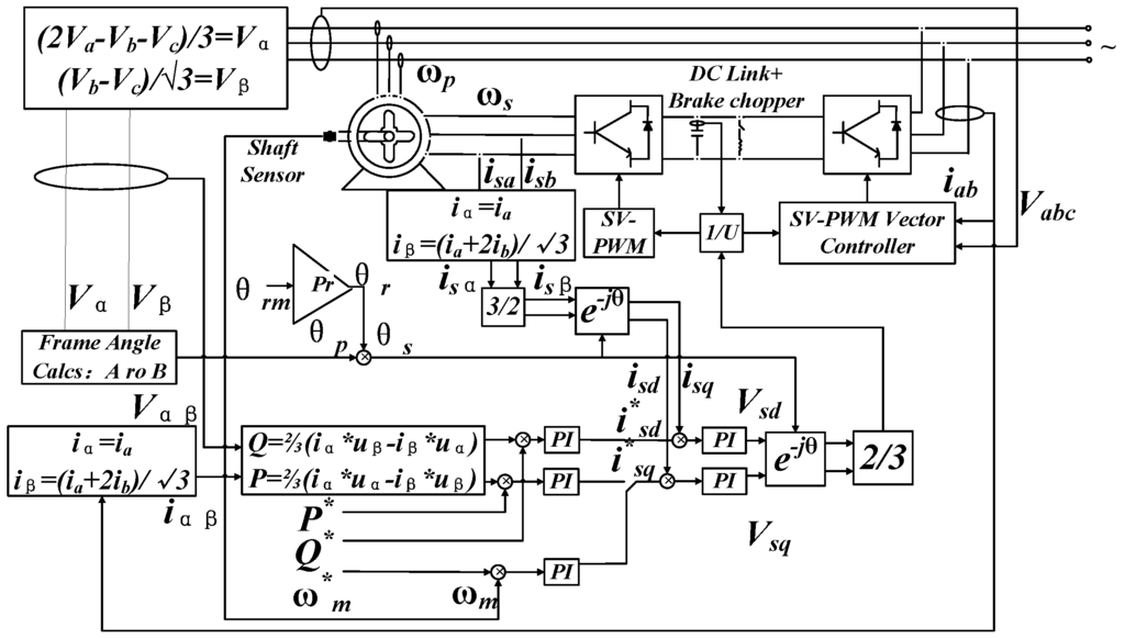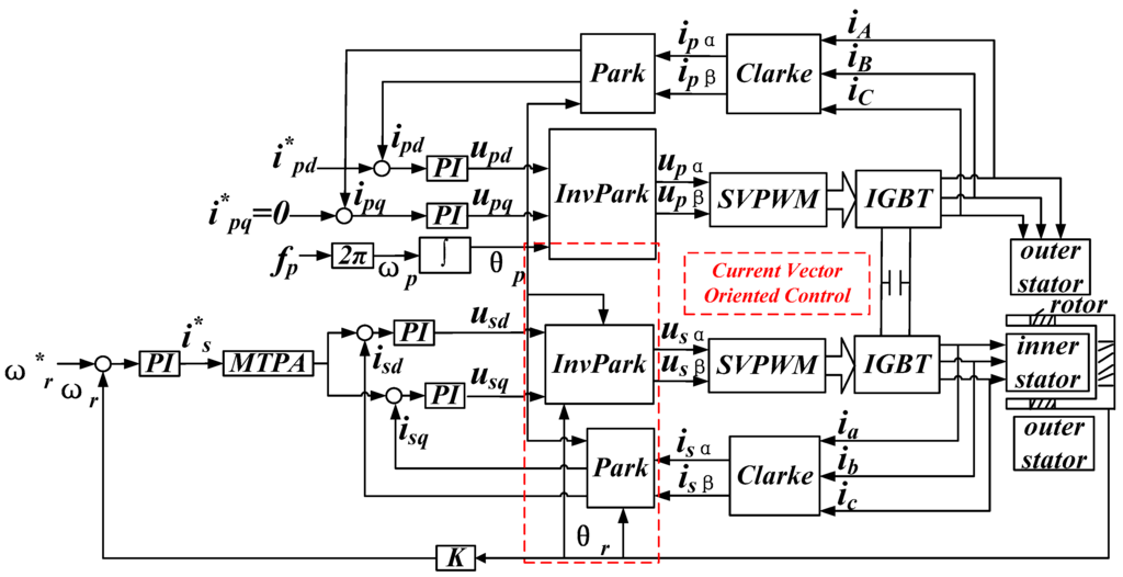 This relationship must be satisfied at any time so that the secondary frame can be oriented according to the rotor angle θr and angle of the primary winding current θp. The SCOVC with AC excitation is referred to as AC excitation control in the following text. The AC excitation control method for the DSFM motor is illustrated in Figure 13.