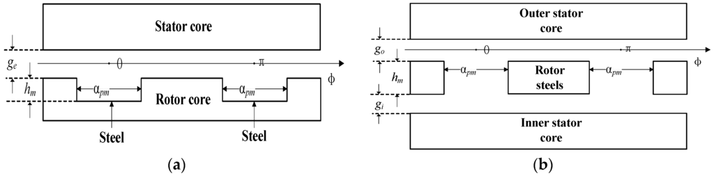 Figure 3 presents the air gap structures in the BDFRM and DSFM motor with an ideal stator surface around the rotor. The air gaps in the two motors were assumed to be uniform, implying that the air gap length between the stator and the rotor teeth is ge and that between the stator and the rotor yoke is ge + hm in Figure 3a, that the air gap length between the two stator and the iron segments on the rotor is go + gi, and that between the outer stator and the inner stator is go + gi + hm in Figure 3b. Based on the preceding analyses, the air gap functions of the two motors are illustrated in Figure 4.