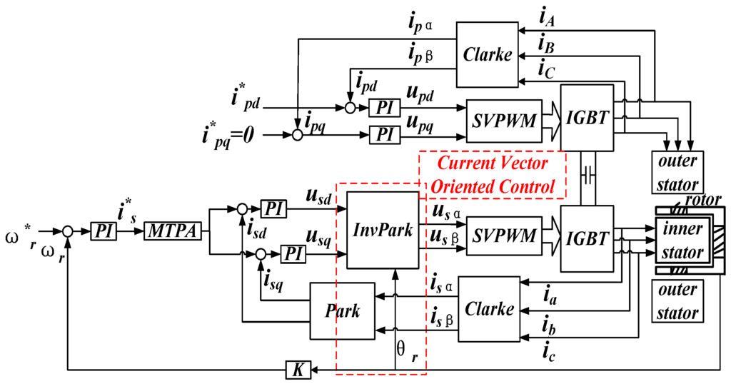 With the direct given current vector in the primary winding, the flux linkage produced by the primary winding current was stationary and constant, and its value could be adjusted by varying the ipd*. The primary winding current vector was set stationary and the secondary winding current vector was oriented by θr. Moreover, the maximum torque per ampere (MTPA) strategy was used to control the secondary winding current isd* and isq*. For the DC excitation control, Equation (6) becomes: