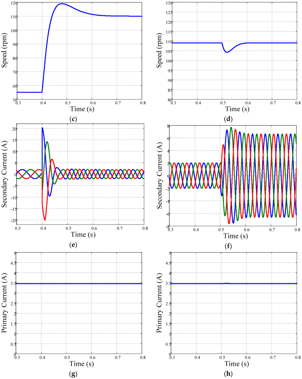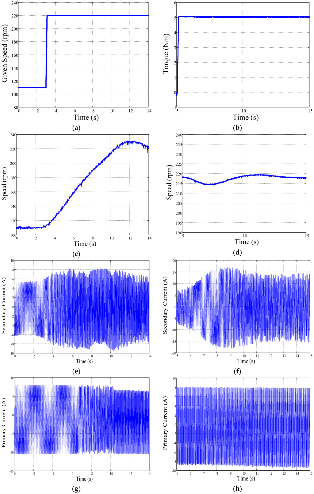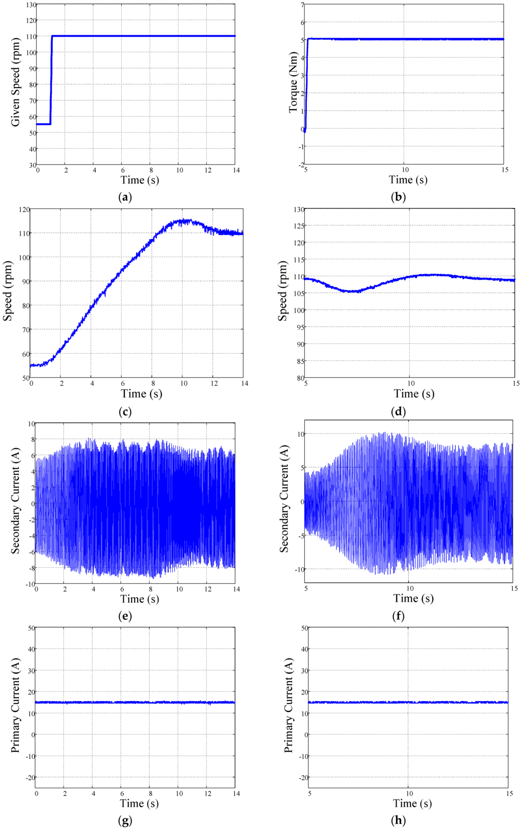 According to Figure 12a, the given speed was increased from 55 to 110 rpm at 1 s; the final speed was stable at 110 rpm. In Figure 12c, the rotor speed was changed by a slow progressive change of the PI control. The secondary winding current was changed during the adjustment period, and the stability was restored by increasing the frequency only twice from 10 to 20 Hz, as shown in Figure 12e. The primary winding current was maintained at a constant value, as shown in Figure 12g, because a DC current was supplied to the primary winding all the time. The steady state errors of the speed were less than 5 rpm.