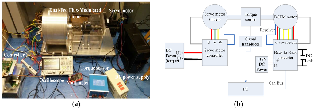 Experimental environment of the DSFM motor: (a) laboratory test facility; and (b) block diagram of the DSFM motor experimental setup.