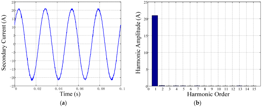 As shown in Figure 11a, the secondary current was asymmetric sine wave and was stable at 36.6 Hz when the DC current in the primary winding was 8 A and the given speed was 200 rpm. The harmonic content of the current was low as shown in Figure 11b.