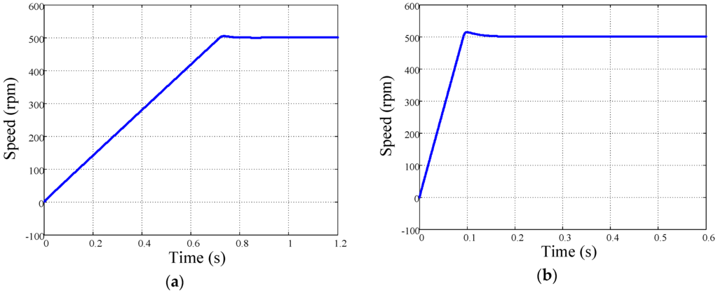 To fully test the performance of the proposed control strategy, start-up of the motor under load was simulated, and the results are shown in Figure 14. The given speed was 500 rpm and the load torque was 1.4 Nm.