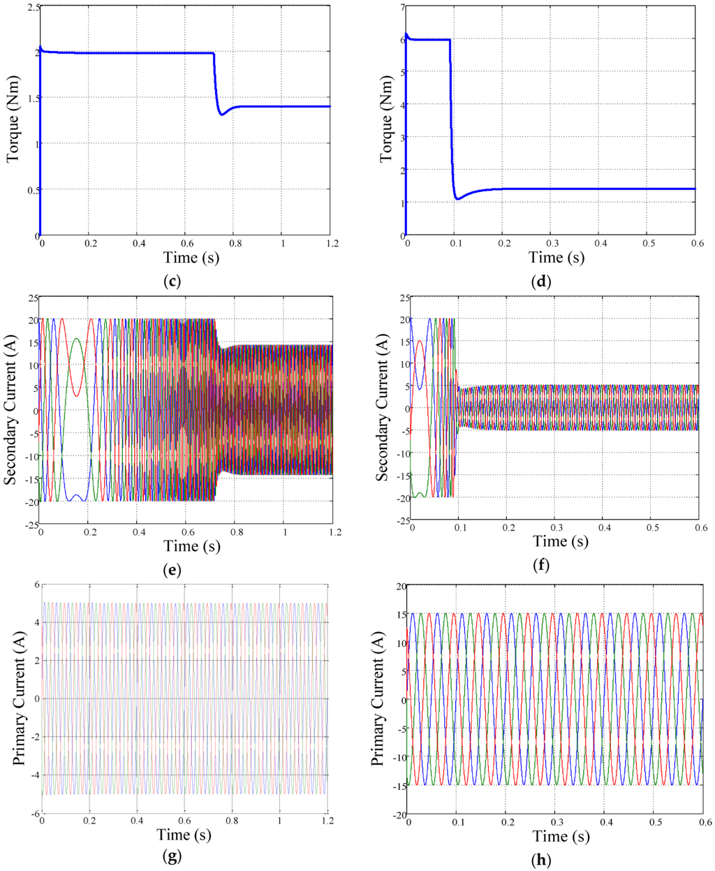 Simulation results of the start-up of the motor under load: (a) speed curve for i*pd = 5 A; (b) speed curve for i*pd = 15 A; (c) torque curve for i*pd = 5 A; (d) torque curve for i*pd = 15 A; (e) secondary current curve for i*pd = 5 A; (f) secondary current curve for i*pd = 15 A; (g) primary current curve for i*pd = 5 A; and(h) primary current curve for i*pd = 15 A.