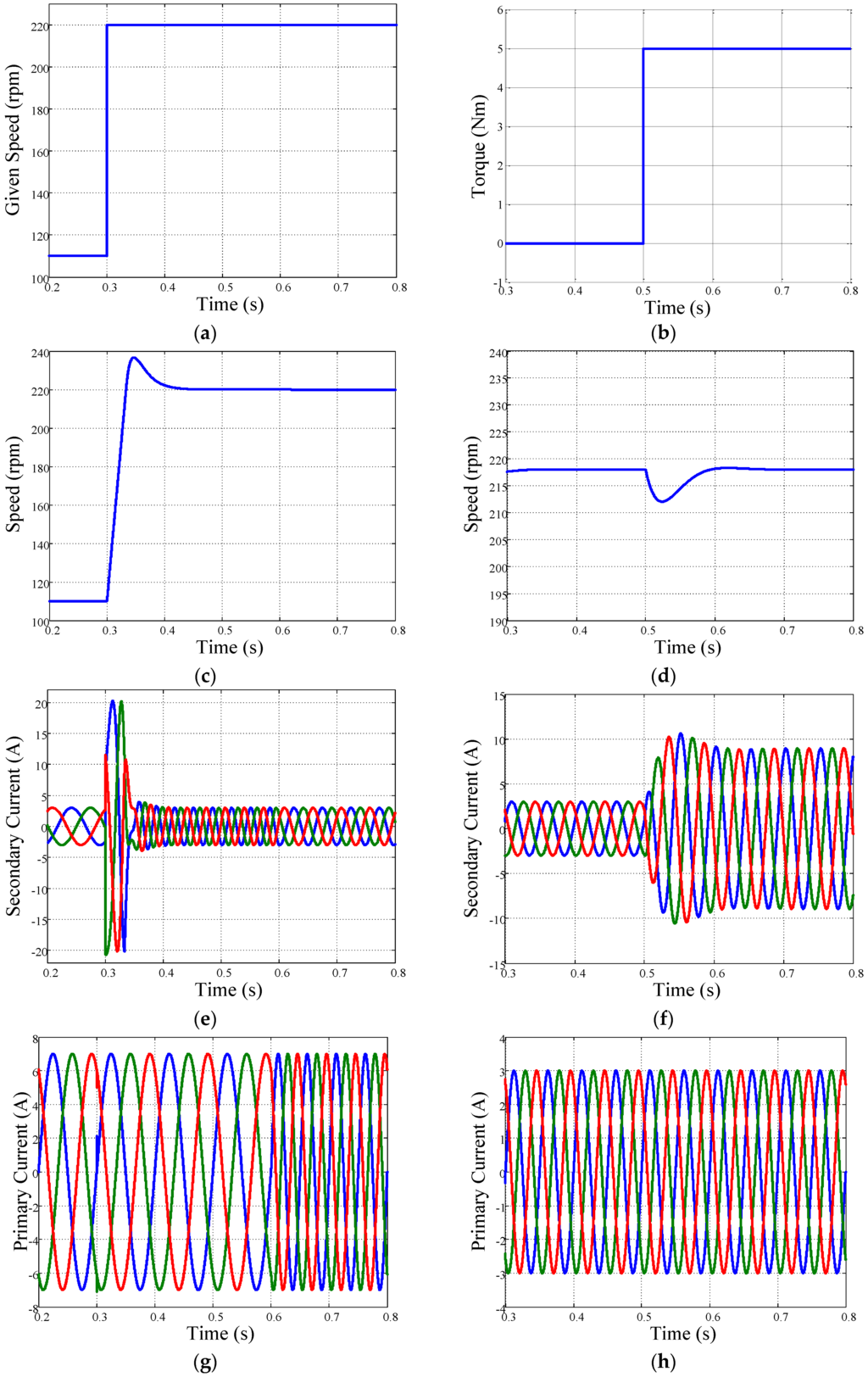 Simulation results of the AC excitation control for the DSFM motor: (a) curve of the given speed variation. (b) curve of the load torque variation; (c) speed curve for speed varying from 110 to 220 rpm; (d) speed curve for torque varying from 0 to 5 Nm; (e) secondary current curve for speed varying from 110 to 220 rpm; (f) secondary current curve for torque varying from 0 to 5 Nm; (g) primary current curve for speed varying from 110 to 220 rpm; and (h) primary current curve for torque varying from 0 to 5 Nm.