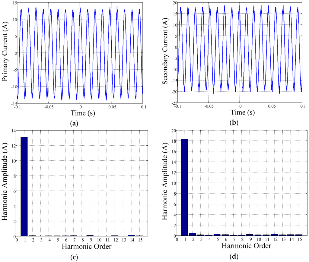 Winding currents of the DSFM motor at 924 rpm: (a) primary winding current; (b) secondary winding current; (c) the harmonic content of the primary current; and (d) the harmonic content of the secondary current.