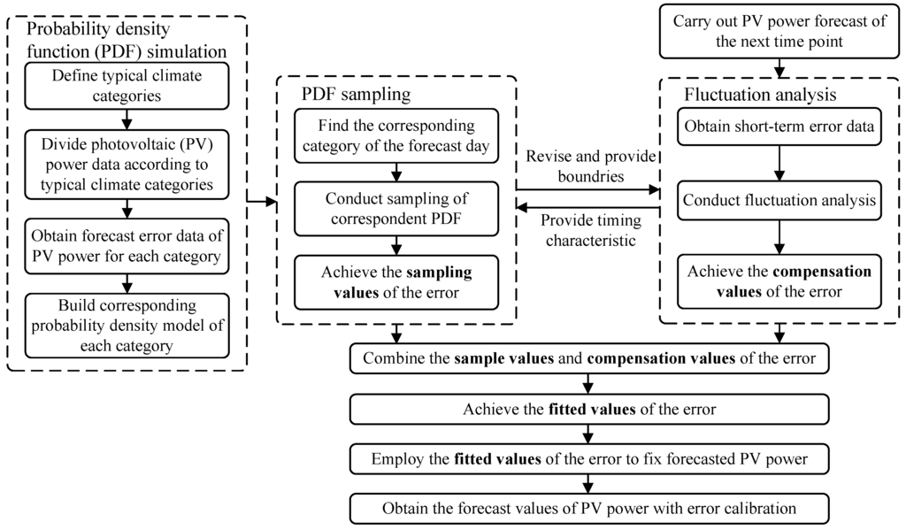 There exist two types of error calibration methods to date. One is to apply a statistical approach to simulating the PDF curves of the PV power forecast error by judging the probability density features of which the error of the next time point would be analyzed and estimated. The other is to predict the error value of the next time point directly using mathematical models to correct the PV power forecast values with the predictive values of the error.