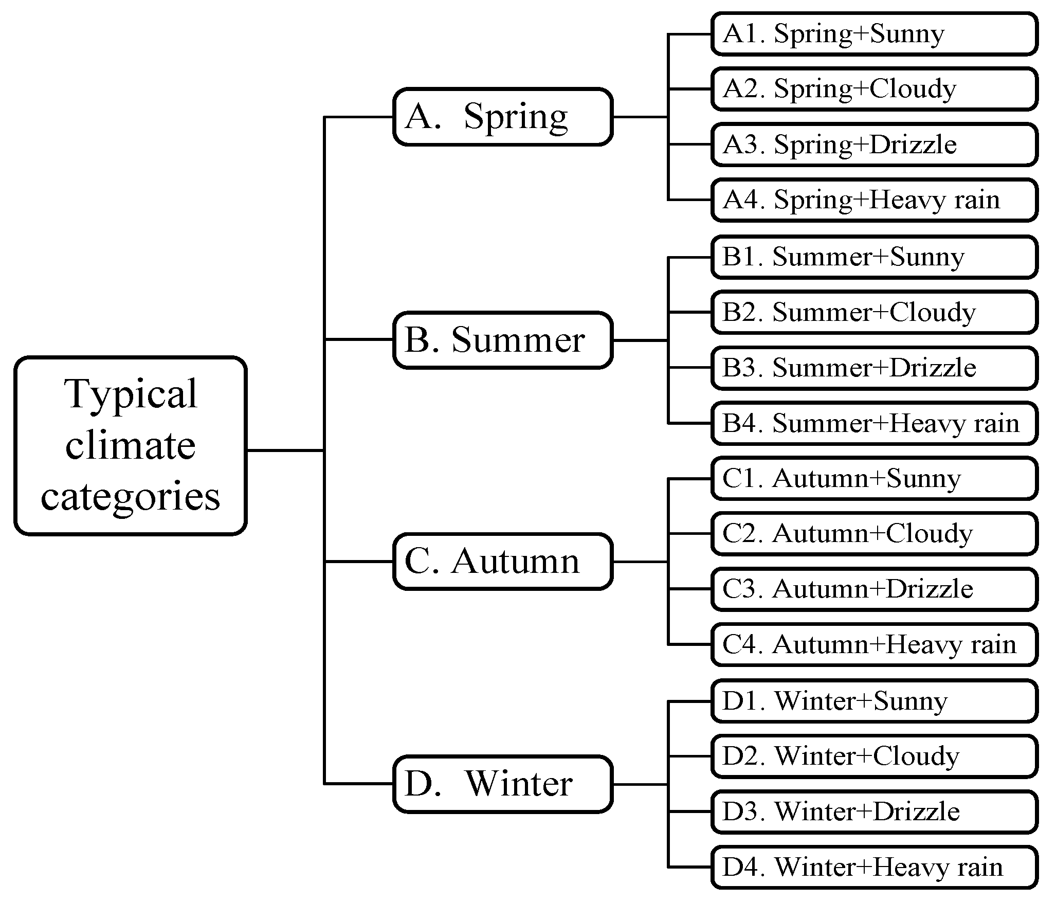 PV power is closely related to climate conditions, which depend on a range of issues and can be described by many different approaches. To define the classification of climate categories using a harmonized standard, the China Meteorological Administration released “GB/T 22164—2008 Public Climate Service—Weather Graphic Symbols”, on which 33 types of climate categories are defined [21]. On that basis, the weather conditions can be classified into four categories that represent the most vital characteristics of these climates, which include Sunny, Cloudy, Drizzle and Heavy rain [8]. However, the range of PV power for each category varies over the different seasons. For instance, the maximum PV output on sunny days in summer is apparently higher than it is in winter. Consequently, the classification of the typical climate categories is based on both the weather and the season, which generates a total of 16 categories, as shown in Figure 2.