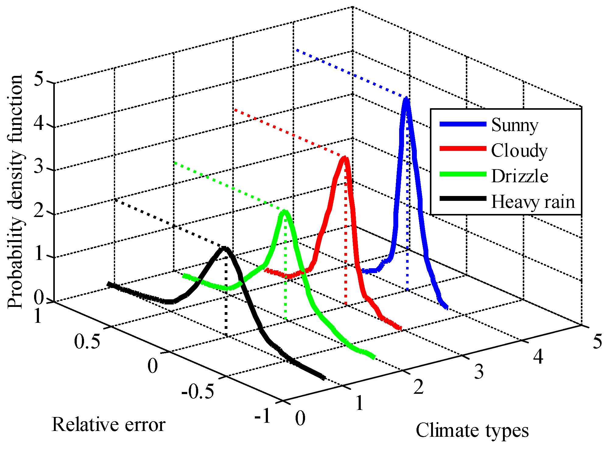 The probability density function (PDF) of the RE predicted by the wavelet neural network (WNN) [22] of the Polycrystalline Silicon Photovoltaic Array (10 kW) in the State Key Laboratory of New Energy Power System at the North China Electric Power University (Baoding, China) in spring is shown in Figure 3. Regardless of the climate type, the PDF of the RE is unimodal and almost symmetric, and the peak time is when the RE value is approximately zero. Moreover, the values of the PDF tend to decline with an increase in the RE absolute values and ultimately reach zero.