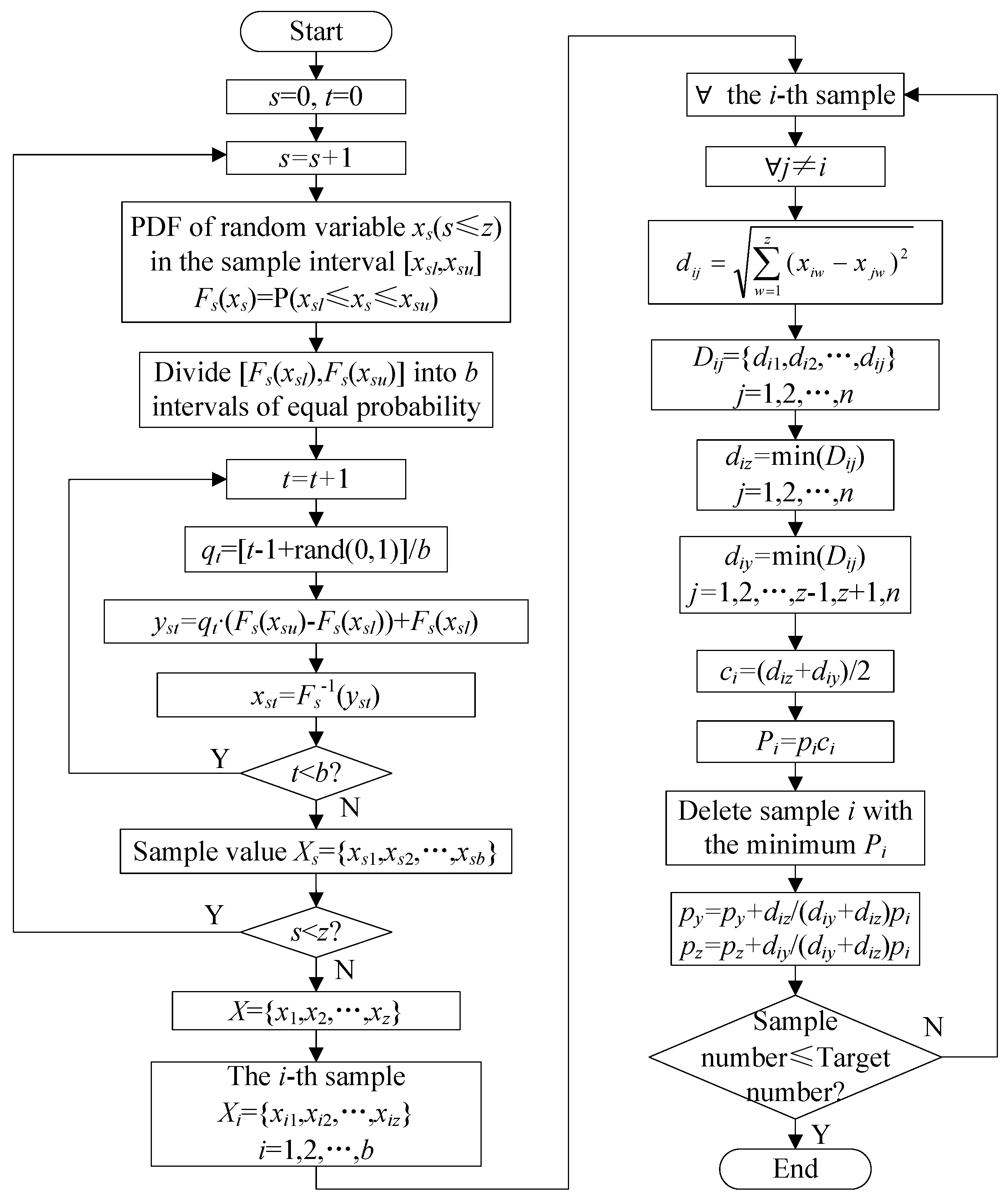 Latin hypercube sampling is a multi-dimensional stratified sampling method, which is able to effectively restore the random effect. Latin hypercube sampling is combined with a multi-scenario technique [27,28] to perform the sampling of the fitted PDF of the RE in the classified categories. During sampling, the sampling size is assumed to be b, and the random variable number is assumed to be z. The variables can be represented as X = {x1, x2,…, xz}. After the sampling, the random variable number is reduced to N. The specific steps of the Latin hypercube sampling and the scenario reduction are illustrated in Figure 4.