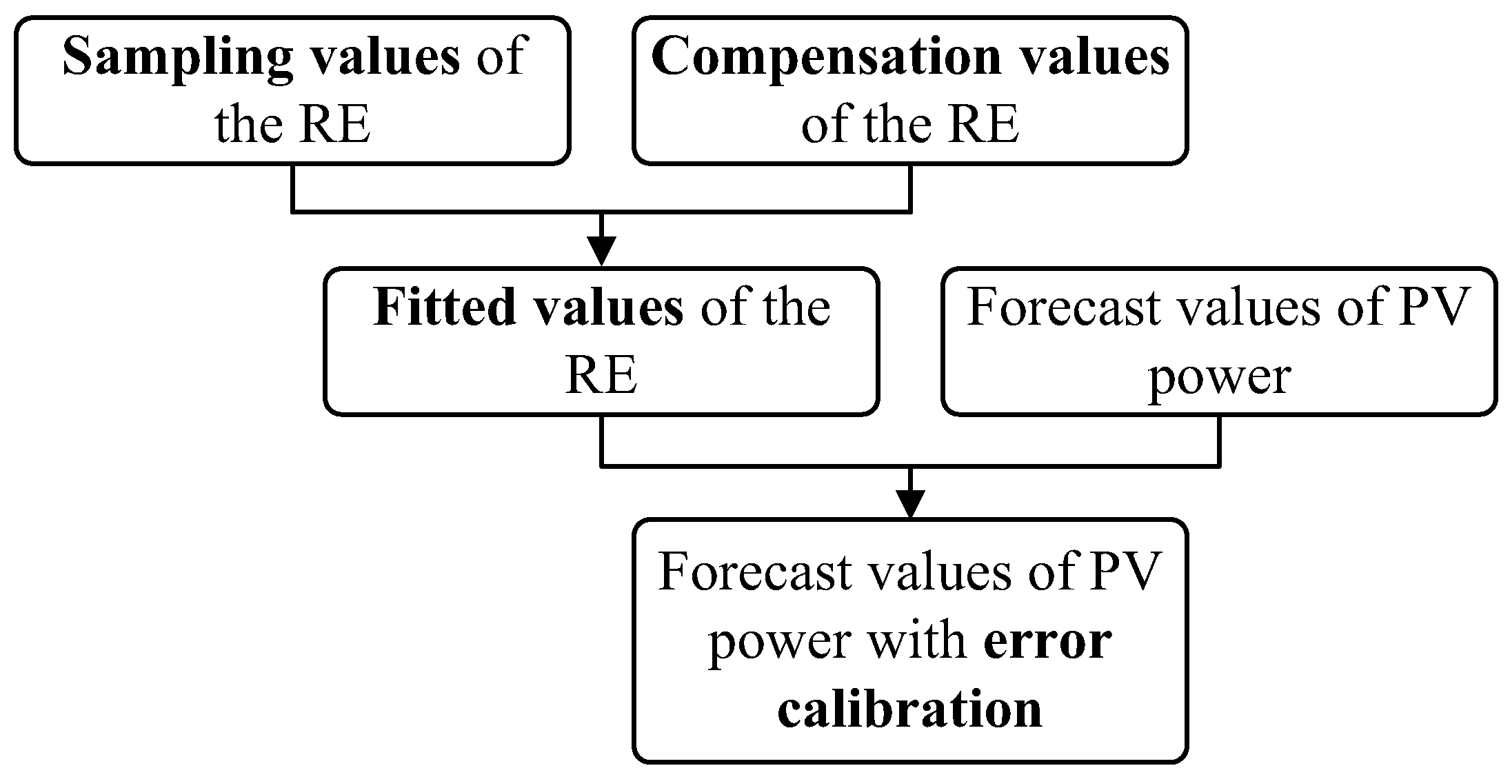 - Combine the forecast values of the PV power in Step (4) with the fitted values of the RE in Step (7) to achieve PV power forecast values with error calibration.