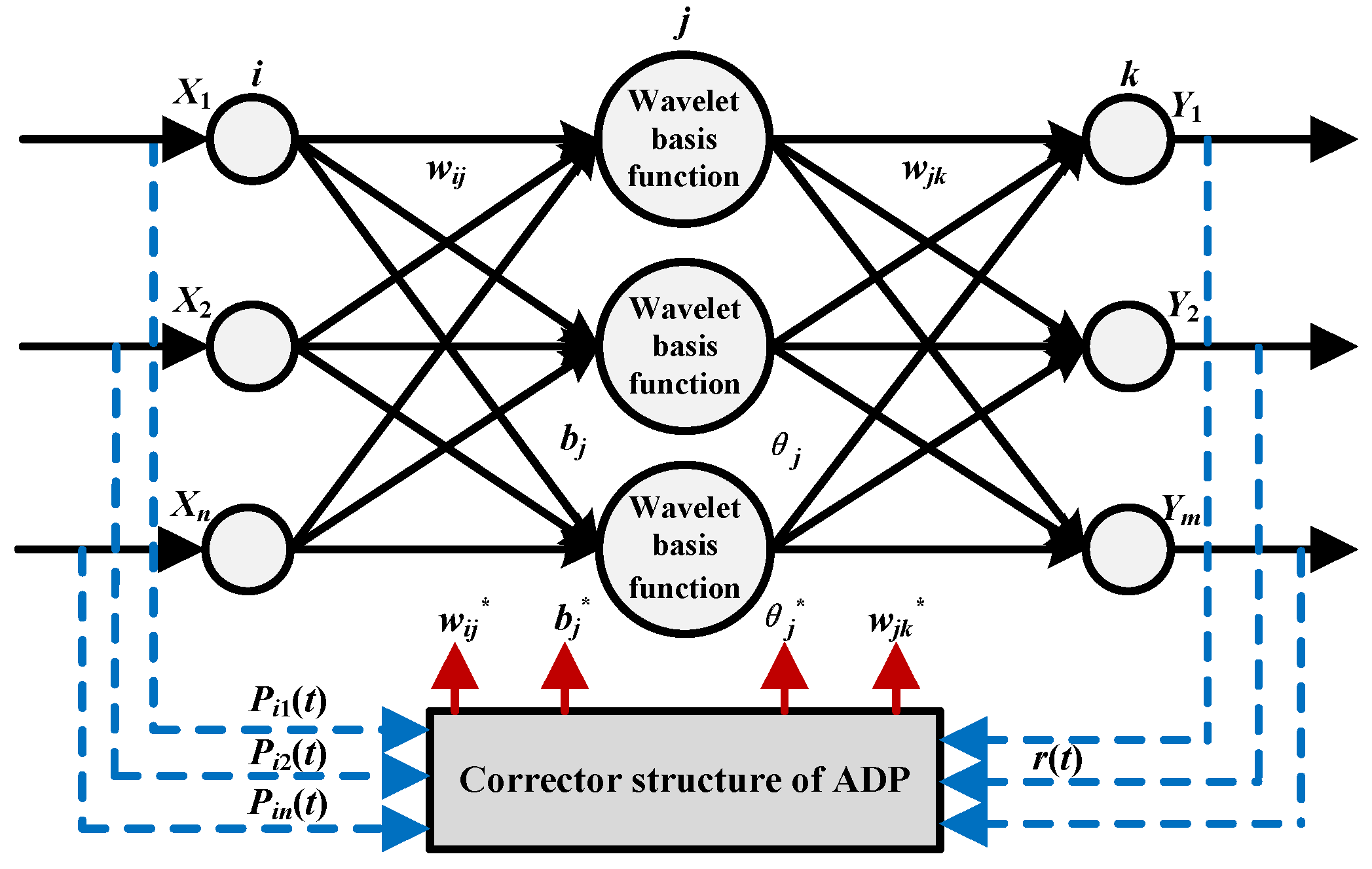 In Figure 6, X1, X2,…,Xn are the inputs of the prediction model; Y1, Y2,…,Ym are the outputs of the prediction model; wij is the weight between the input layer and the hidden layer of the WNN; wjk is the weight between the hidden layer and the output layer of the WNN; bj is the expansion factor of the wavelet basis function; θj is the threshold; Pi1(t), Pi2(t),…, Pin(t) are the actual measurement data of the sampling period; wij*, wjk*, bj*, θj* are the updated parameters after occupying the ADP corrector; and r(t) is the cost function.