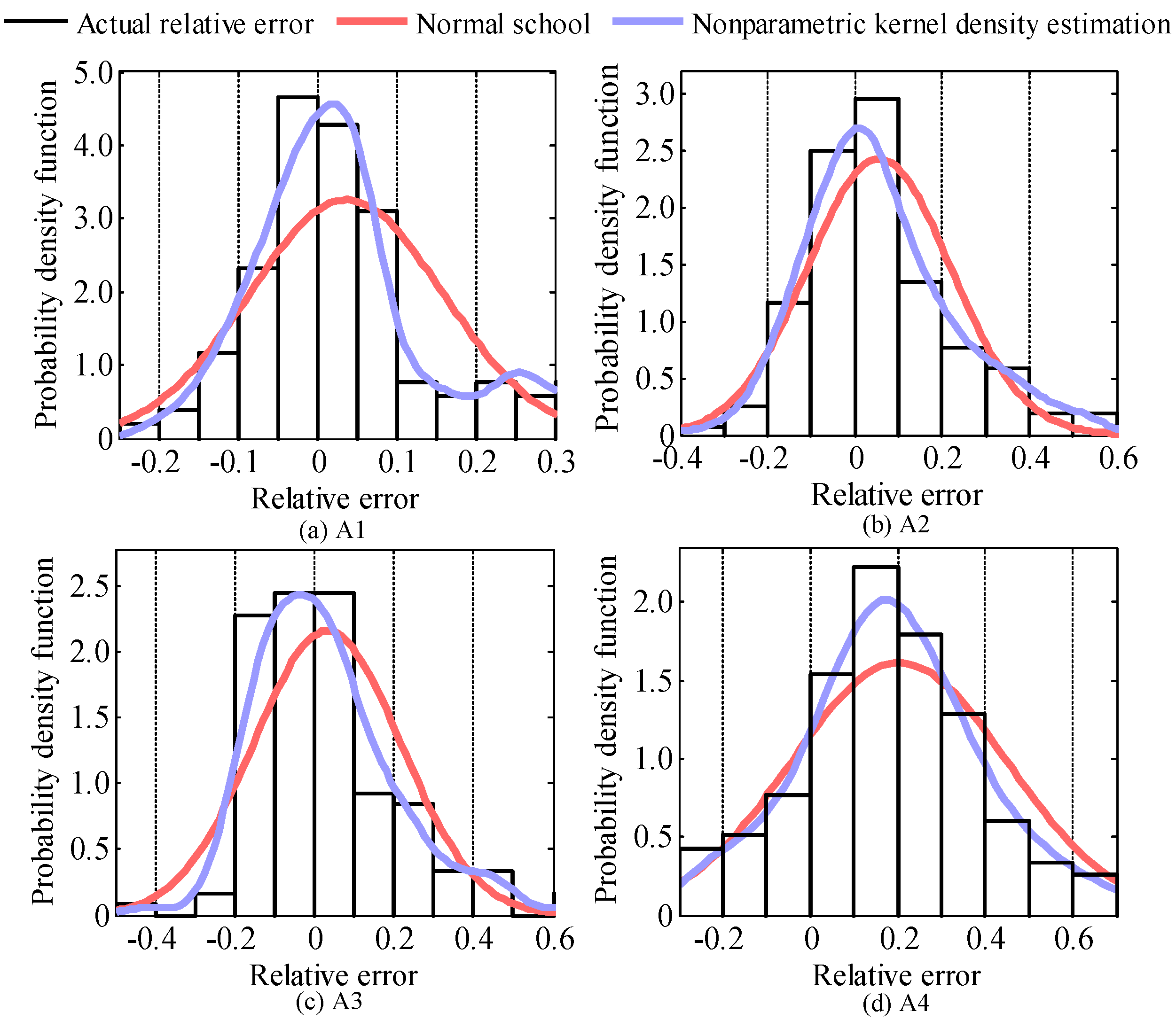 (a) Fitted PDF of the RE of A1; (b) fitted PDF of the RE of A2; (c) fitted PDF of the RE of A3; and (d) fitted PDF of the RE of A4.