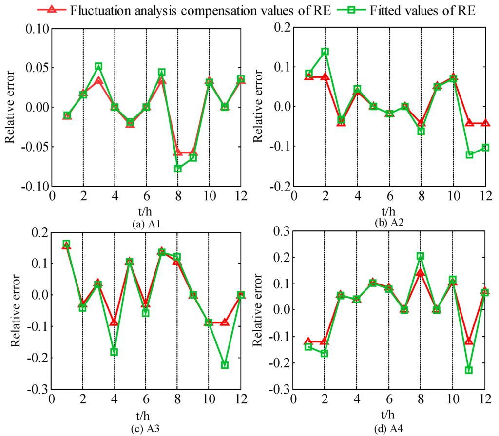 The uncertainties of PV power and the prediction methodologies are the main sources of PV forecast error. Considering the regularity of the fluctuated direction of the RE in short-term predictions, the fluctuation analysis of the RE is a feasible scheme to prejudge the tendency of the RE and to produce the corresponding compensation values of the RE [29].