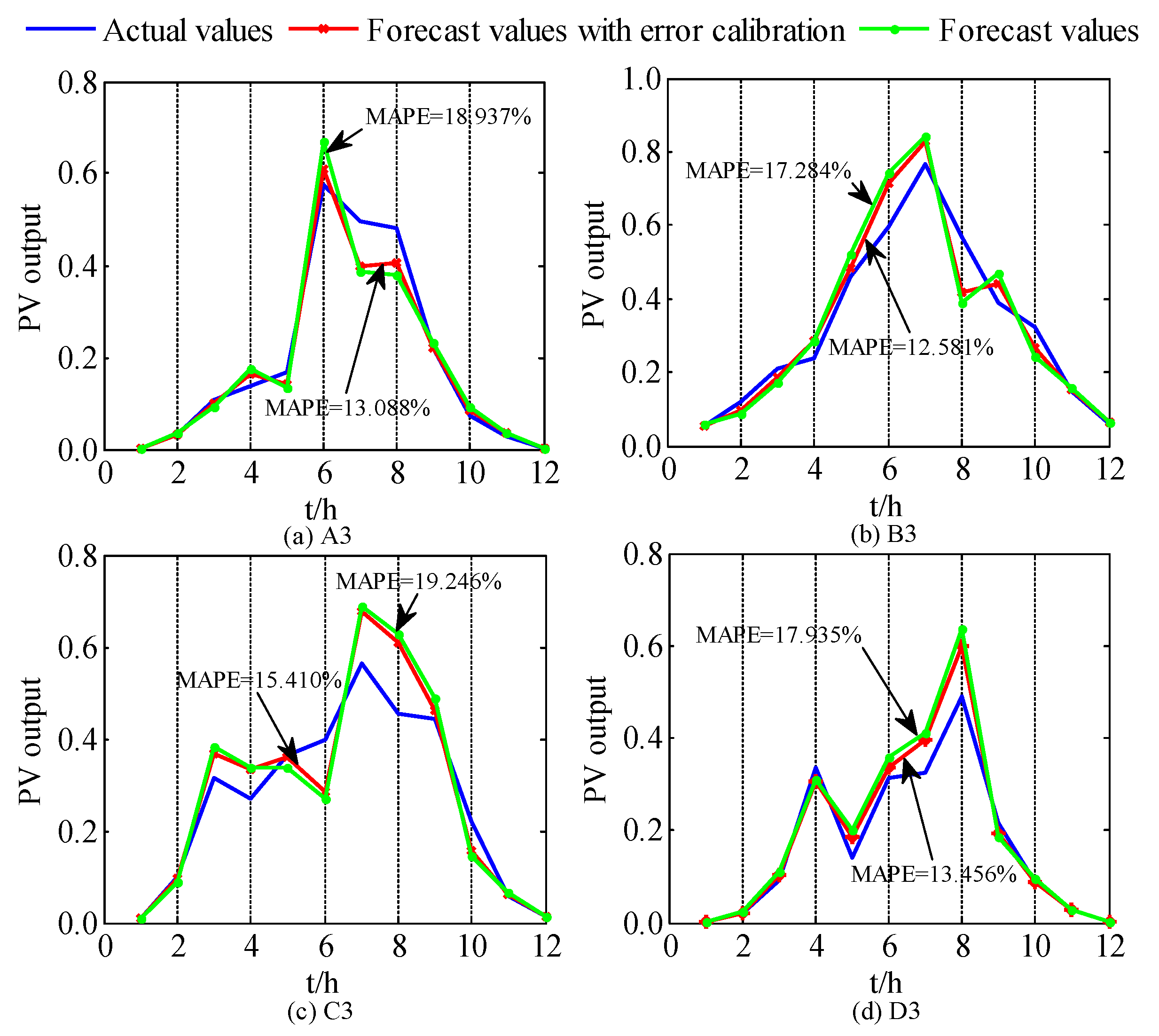 The probability density curves of the RE under each category are sampled based on a Latin hypercube sampling and a multi-scenario technique. Due to the low probability of the occurrence of large errors, the sections with peak values at their center with a probability of 85% are chosen to be the actual sampling intervals, in order to avoid the overcompensation of errors phenomenon caused by excessive sampling results. The sampling results of the RE are sorted according to the fluctuation analysis. The compensation error results and the final fitted values of the RE for A1–A4 are shown in Figure 8. The forecasted results by the WNN with ADP are corrected by the fitted values of the RE to obtain the forecasted PV power output with error calibration. The final forecasted results for A1–A4 are shown in Figure 9, and the forecasted results under the drizzle weather condition in each season are shown in Figure 10. It is obvious from the two figures that after combining with an error calibration, the forecasting accuracy of each category can be improved to a certain extent. Figure 8, Figure 9 and Figure 10 indicate that the fitted values of the RE can effectively eliminate the extreme values in the fluctuation analysis, aiming to avoid divergence and the overcompensation of error. Furthermore, the fluctuation analysis possesses the preliminary capacity of estimating the compensation values of the RE. Sorting the sampling error based on the compensation values, the forecasted PV power can corresponds correctly to the fitted RE. Due to the error calibration, the error can be compensated, and the forecasting accuracy can be improved.