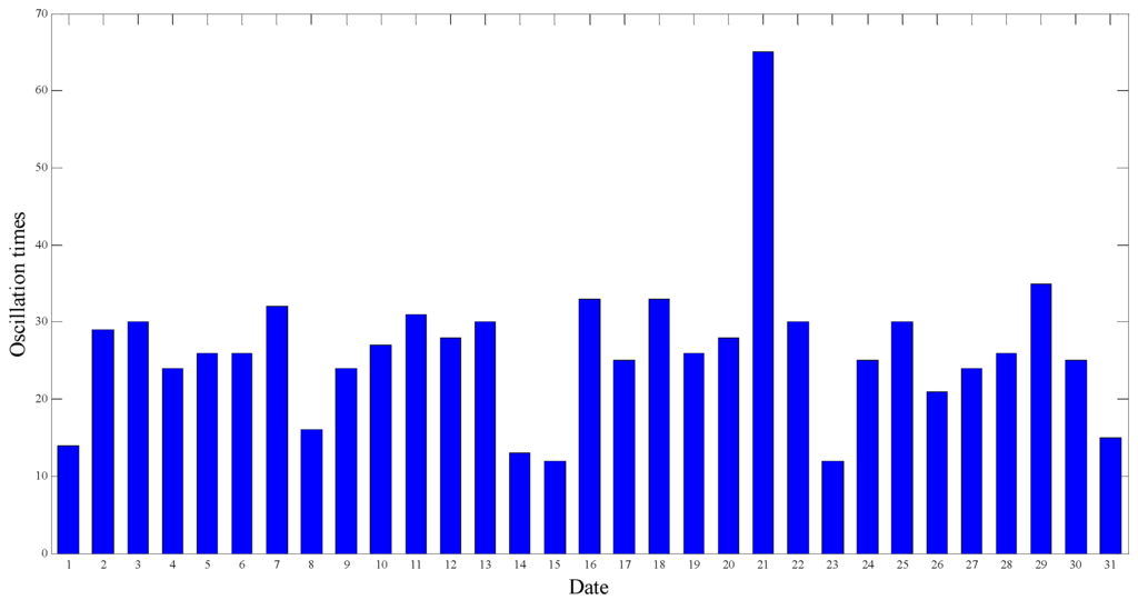 In January 2015, oscillations occurred 815 times on the UHV tie line. The maximum amplitude of the oscillations is about 330 MW, while the transmission power of the UHV tie line is about 1600 MW. The distribution of daily oscillation times during this period is shown in Figure 1. It can be seen that the oscillation times are approximately uniformly distributed during one month, and the oscillation happened from 12 to 65 times every day, which indicates that the UHV tie line oscillations happened very frequently every day.
