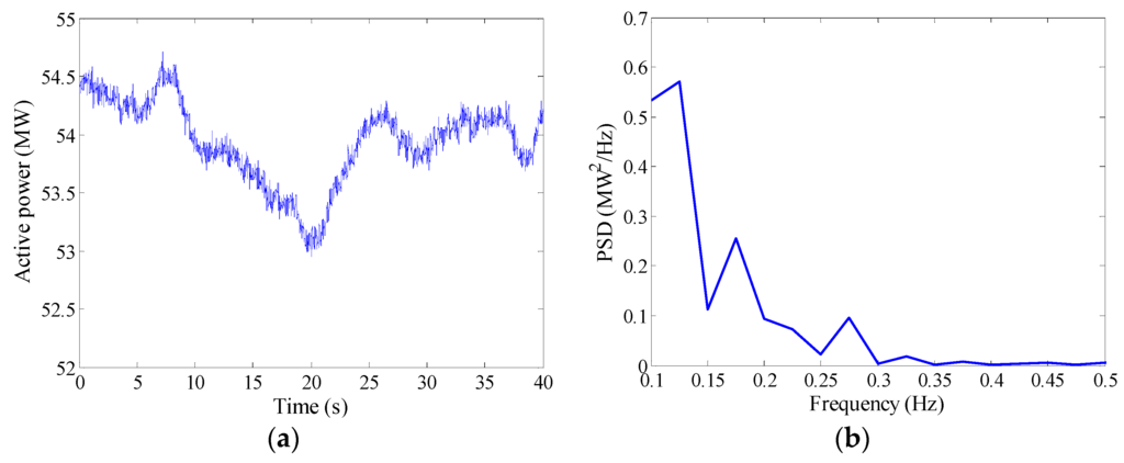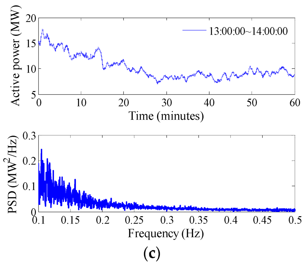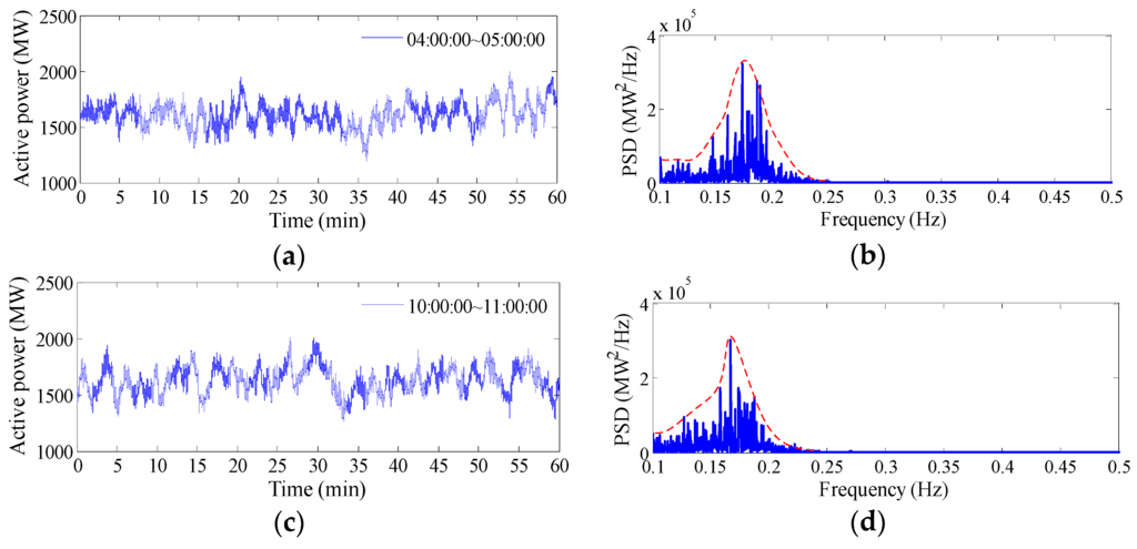 A wind farm is located near the UHV tie line and its installed capacity is 80 MW. The active power output data of this wind farm on 1 January 2015 are collected from WAMS. The high wind power usually appears in the morning and evening following the variation rule of wind speeds. The maximum output power during this day is about 55 MW, while the minimum output power is about 6 MW. The dynamics and the PSD of the output active power during the peak, trough and medium periods are shown in Figure 5a–c, respectively. It can be seen that although the wind power shows different time-domain characteristics in different time periods, the properties in the frequency domain are similar. The power fluctuation energy decreases gradually with an increase in frequency. The majority of this energy distributes on a narrow frequency band that ranges from 0.1 to 0.3 Hz, and energy level are very low at other frequencies.