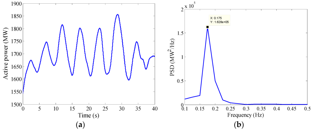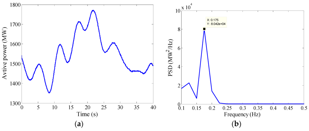According to the analysis above, the UHV tie line oscillations mainly have four features, i.e., medium-sized amplitude, frequent occurrence, strong randomness in time domain and sharp wave shape in frequency domain. To explain the mechanism of the observed inter-area oscillations better, the UHV tie line oscillation observed from 22:45:00 to 22:45:40 on 1 January 2015 is chosen as the example for further study. The dynamics and the PSD of the oscillation are shown in Figure 3a,b, respectively.