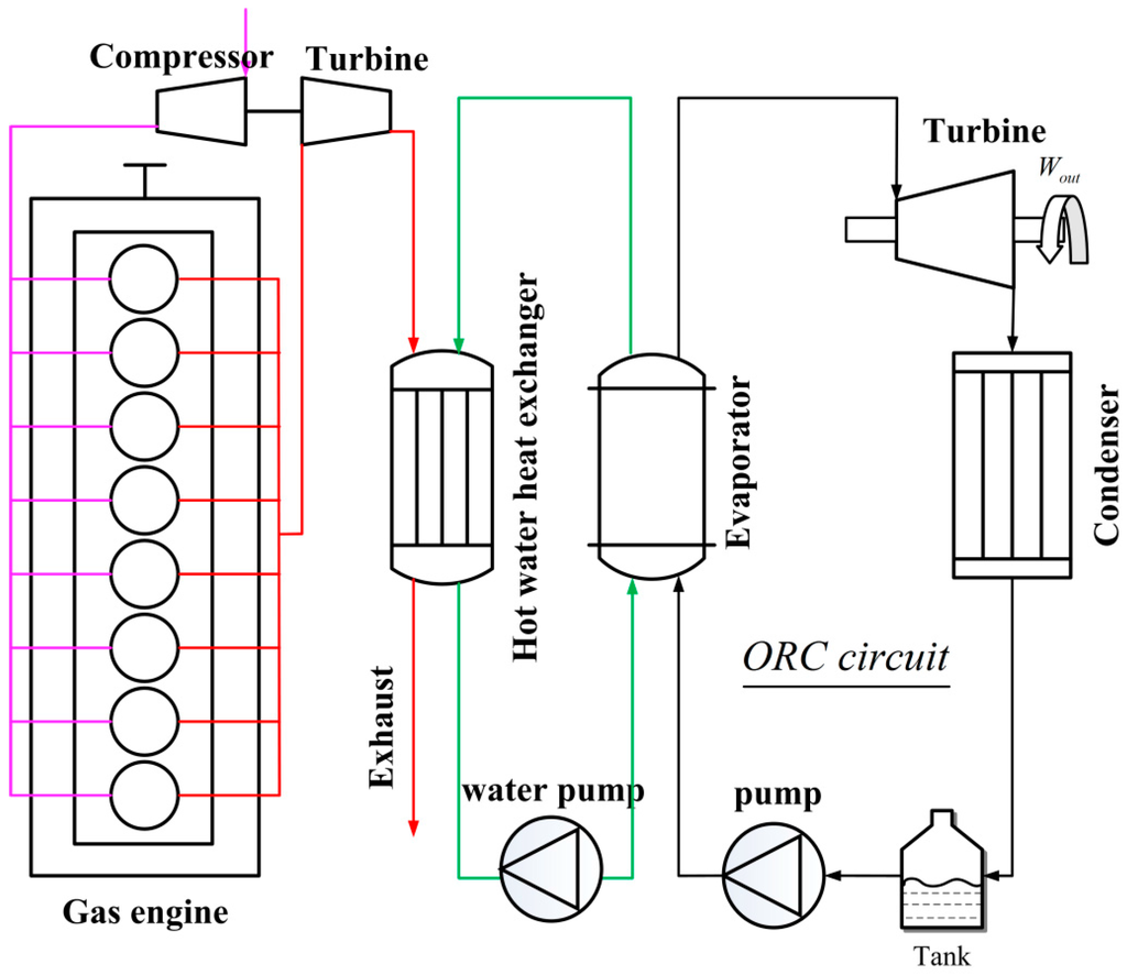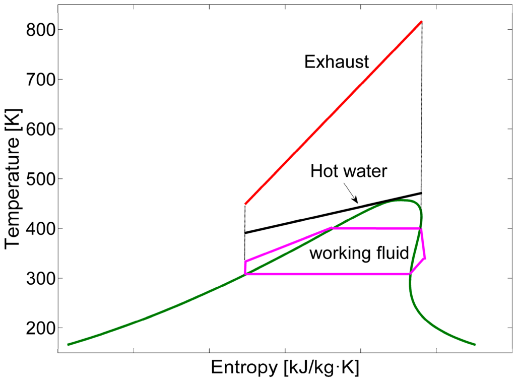 The fundamental principle of the system is simple: the exhaust heats water first and then the hot water is the heat source of the ORC system. It should be noticed that the hot water cycle is pressurized in order to avoid using a steam boiler. The working fluid is heated into high temperature and pressure vapor by hot water and then the vapor expands in a turbine or expander to generate power, decreasing the temperature and pressure. After that, the vapor is cooled into liquid form in the condenser. Finally the liquid working fluid is pumped to the preheater again and starts a new cycle. The system diagram and T-S diagram are shown in Figure 1 and Figure 2.