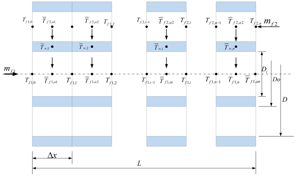 As there is no phase change in the water heat exchanger and the temperature of exhaust drops a lot, the discretization method is used to establish this sub-model. In the discretization model of the water heat exchanger, this straight pipe of the water heat exchanger has been split into n longitudinal lumped volumes, each of length Δx as shown in Figure 3. For each discrete volume, three nodes can be defined in the radial direction: one referring to the fluid within the internal pipe (referred to as f1); one referring to the state of the metal constituting the metal pipe (referred to as w); one referring to the state of the fluid in the annulus (f2). The discretization nodes are located at the centre of the different control cells and their state is represented by the average state of outlet and inlet of the control cell.