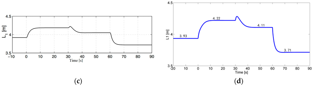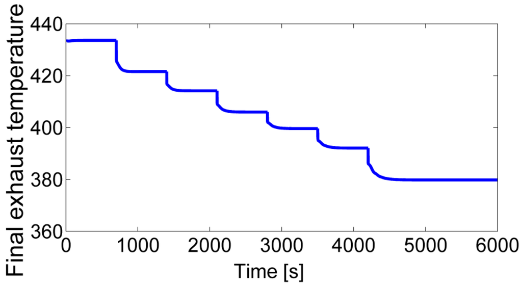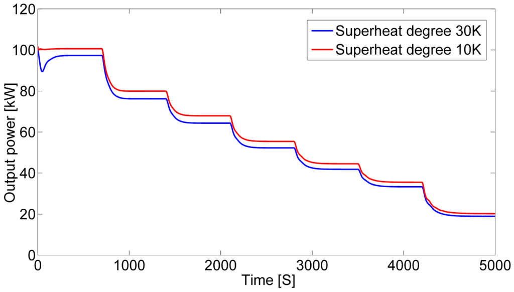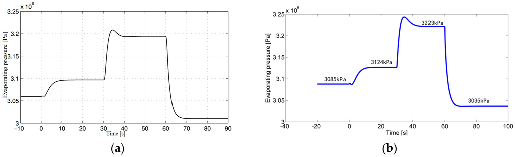 It is very hard to find a mathematical model totally identical as the one in this research. The math model in this paper is based on [11], but a lot of modifications and improvements have been made in this mathematical model, such as the model of MC and the MB model of exhaust so that it can calculate the dynamic process of ORC-MCs under different engine work conditions. Before the modifications and improvements, the math model is validated with the ORC dynamic model in [11]. Figure 5a, c show the transient response of the system in [11]; Figure 5b,d show those with the math model in this study. At 0 s the pump speed is increased by 5%, at 30 s the outer heat transfer coefficient is increased by 10% and at 60 s the nozzle coefficient is increased by 10%. It can be seen that the calculation result are almost the same and the maximum difference is below 1%.