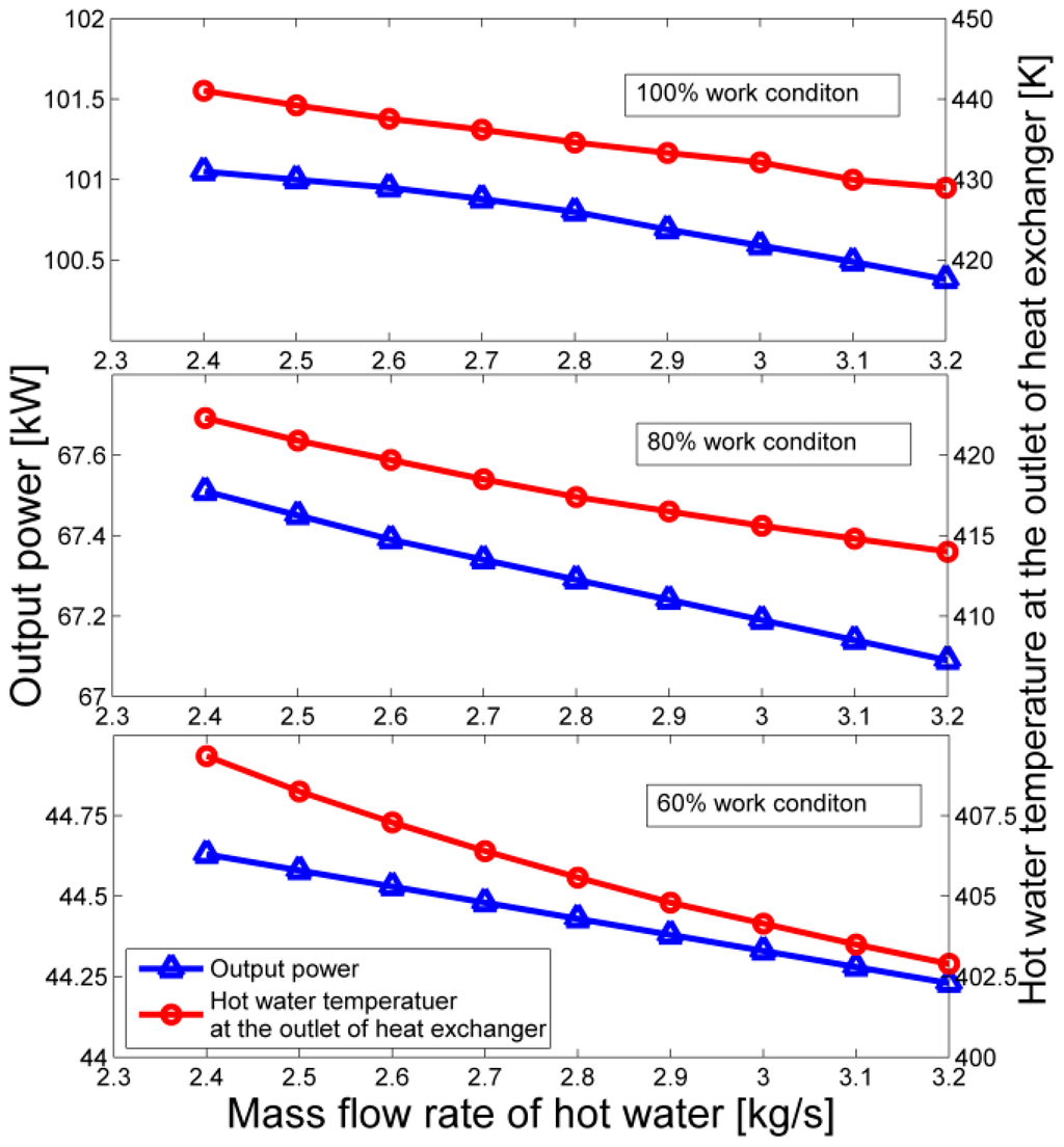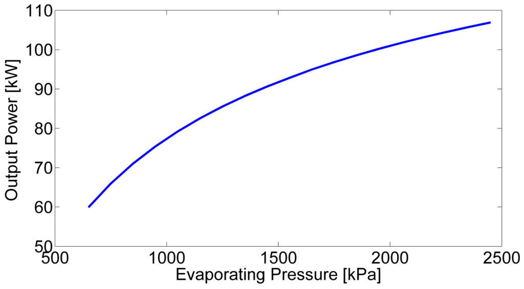 The ORC system with hot water cycle is designed based on the rated working conditions of the gaseous fuel engine and the exhaust properties at the rated working conditions are listed in Table 1 above. The ORC in this work is a subcritical cycle. Before the system design, the optimization of work fluid evaporating pressure is done, as shown in Figure 6. From the figure it can be seen that the output power increases with rising evaporating pressure more and more slowly. Considering that too high an evaporating pressure leads to a large expansion ratio in the turbine, which makes the manufacture too difficult and the cost too expensive, and under some severe cases the evaporating pressure will be higher than design pressure, the design evaporation pressure is set at 2 MPa. The condensation temperature is set as 308 K, which is mainly decided by the environmental temperature. In order to avoid corroding the pipe wall, the exhaust temperature cannot drop below the acid dew point [41]. The acid dew point changes with the sulphur content and it is assumed to be 383 K in the study. Because the exhaust temperature at the outlet of the hot water heat exchanger decreases as the engine working conditions decreases (this will be proved in the text below), the designed final exhaust temperature is 433 K. Other design parameters of the ORC-MC are shown in Table 2 below.