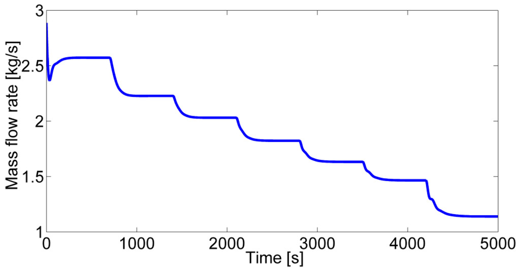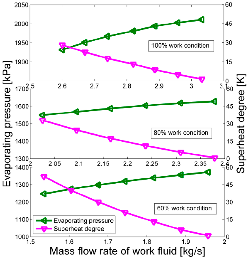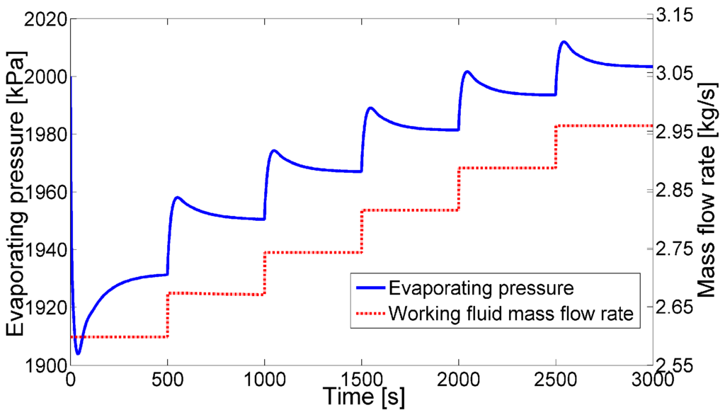 The turbine of an ORC WHRS is usually connected to a generator and in order to make sure the current frequency is constant, the speed of the turbine is constant. Therefore, under all working conditions, the main adjustable parameters of the WHRS are the speed of the water pump in medium cycle and the working fluid pump, which can control the mass flow rate of hot water and working fluid. Therefore, the results and analysis are divided into two parts. In the first part, the effects of the mass flow rate of hot water and working fluid on the system performance at steady state under different working conditions of the gaseous fuel engine are calculated and analyzed to give an operation strategy for the ORC-MC system. The dynamic math model can reflect the dynamic process and finally become steady state, but in this part we just focus on the final steady values of the system parameters. As shown in Figure 7, it reflects the dynamic variation of the evaporation pressure at every step change of working fluid mass flow rate (the rotation speed of pump increases by 5% in every step) and the steady value after every step change is the focus in this section. In the second part, with the control of constant superheat degree at the end of heating process, the performances of the ORC waste heat recovery system under different gaseous fuel engine working conditions are analyzed.