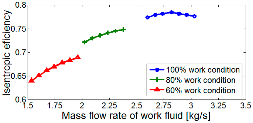 The isentropic efficiency of the turbine is calculated starting from the isentropic efficiency at design conditions (0.8) and multiplying it by two correction factors [12]. The first correction factor (CF1) is related to the variation of u/cs that results from the variation of the isentropic enthalpy drop at part-load conditions, where u is the impeller tangential speed and cs is isentropic gas speed. The second correction factor (CF2) is related to the variation of the mass flow rate. a1, b1, c1 and a2, b2, c2 depend on the specific turbine design.