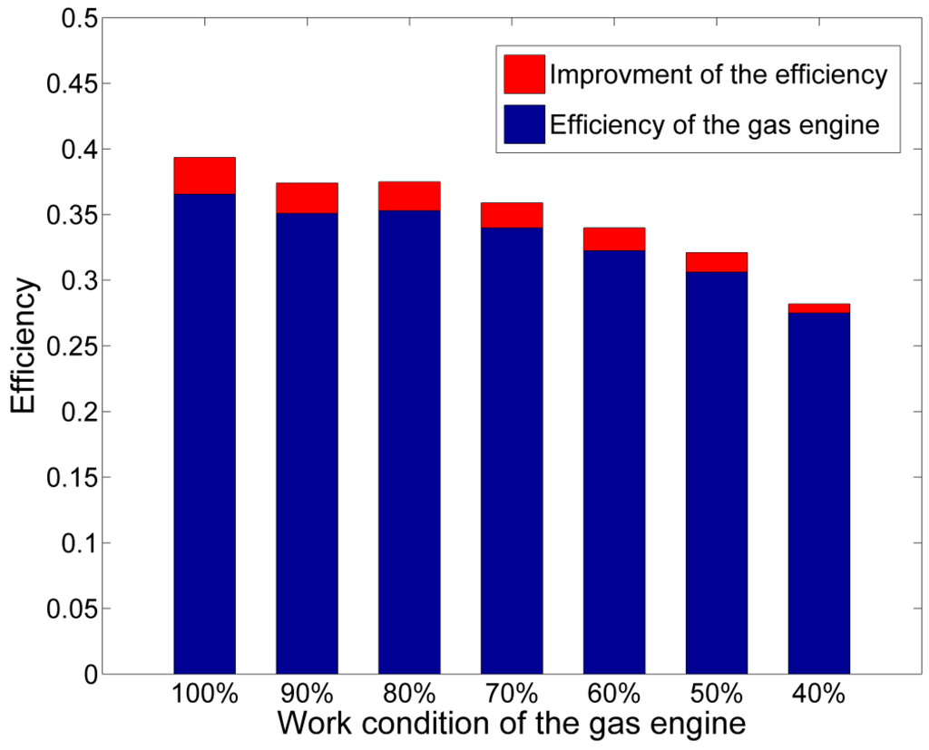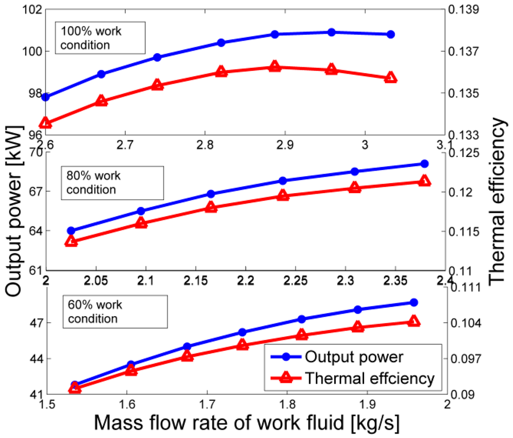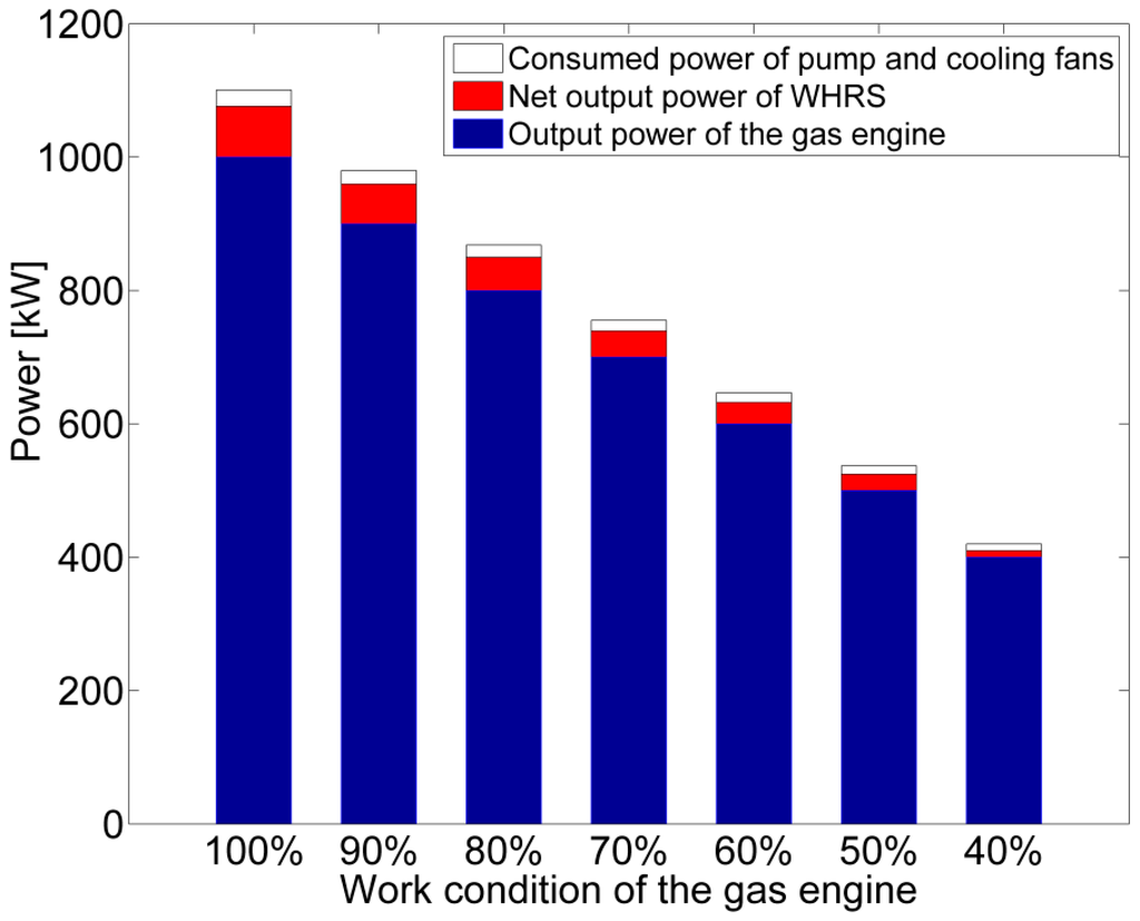 The removed heat in condenser is taken away by cooling air. In order to evaluate the net output power of the combined system (gaseous fuel engine and WHRS), the consumed work of cooling air fans (Wca) are considered and the specific power consumption of the cooling air fans is assumed to be 0.15 kW/(kg/s of air) [12]. Therefore, the net output power and thermal efficiency of the combined system can be expressed as below. Therein, We and Qein are respectively the output power and input heat of the gaseous fuel engine: