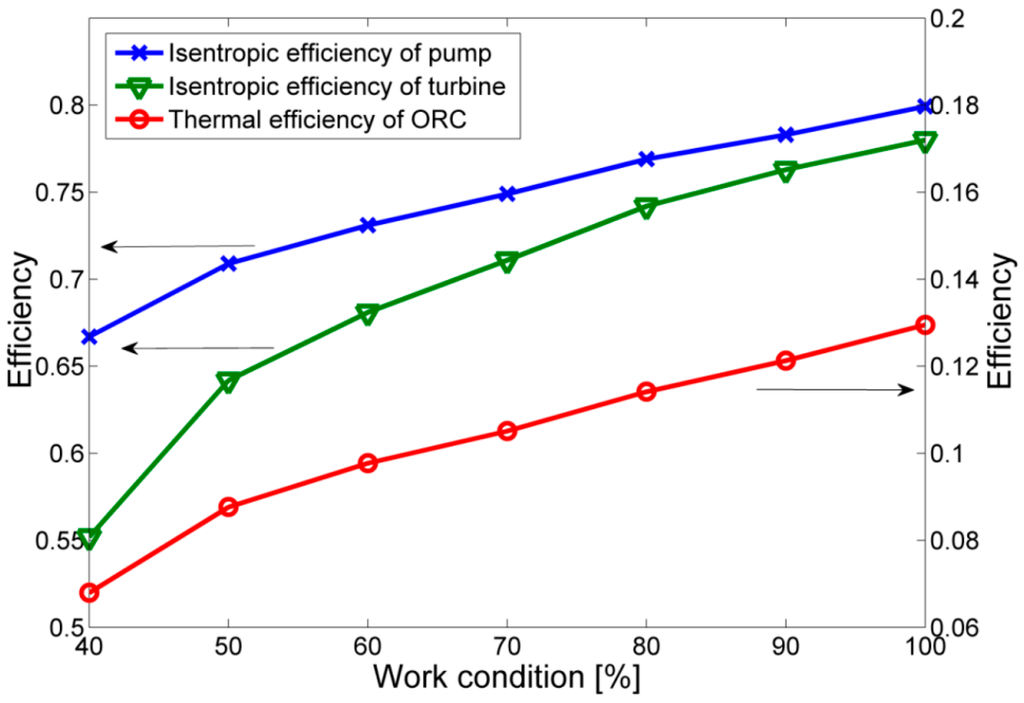The ORC dynamic model can predict part-load performance. Manente et al. [12] presented a detailed dynamic model of an ORC system to calculate the system performance under part-load conditions and find the optimal operating parameters that maximize the electricity production in response to working condition changes. The authors suggested the model can be conveniently applied to both optimization of existing plants and design of new plant configurations. Other studies [13,20] also built an ORC dynamic model as WHRS for an internal combustion engine to analyze the system performance under part-load working conditions.