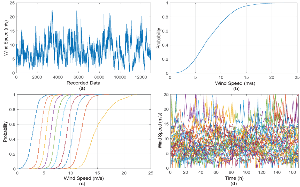 Method for wind scenario generation: (a) wind speed data for winter season; (b) cumulative distribution curve for winter season; (c) cumulative distribution curve for the 10 deciles; and (d) wind scenarios.