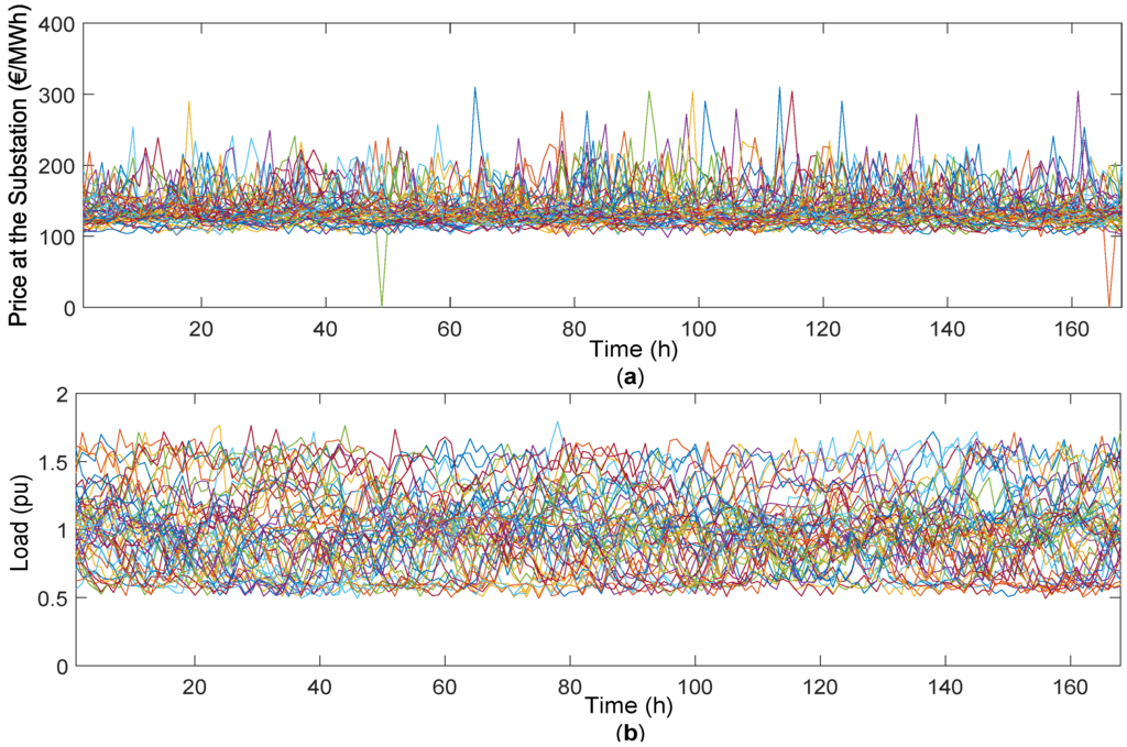 Substation price and load scenarios: (a) price at the substation (€/MWh); and (b) load (pu).