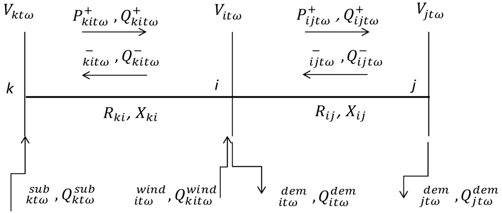 Real and reactive power balance equations at bus i are formulated in Equations (12) and (13). For both active and reactive power, wind power generation, production/storage of ESS, and the power flow from/to the substation are considered: