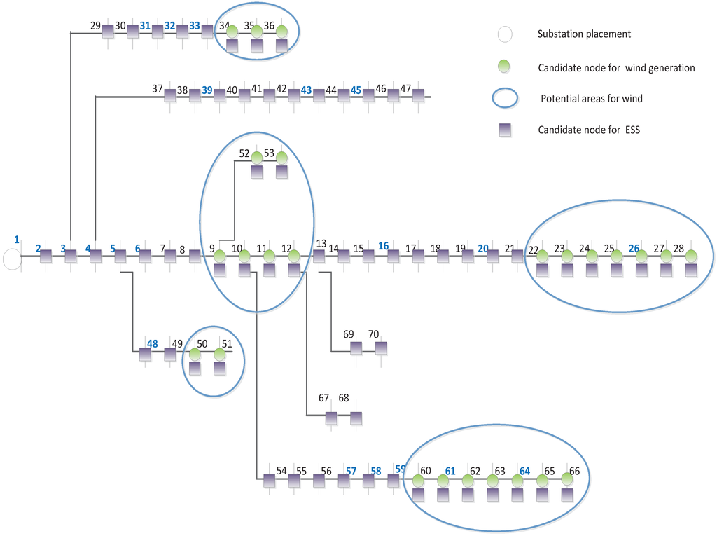 The network used for the optimal location of both wind generation and ESS is the IEEE 69-bus system shown in Figure 6, where the bus numbers in blue are buses that are not connected to loads (as in [29]) and the candidate buses for both wind and ESS are represented. The maximum current flow through the branches is 150 A and network parameters are given in [29]. Since the voltage values vary through iterations, the voltage range is between 1.1 pu and 0.9 pu. In the linearization, 20 discrete blocks are considered since the solutions hardly change from 20 blocks onwards in the piecewise linearization procedure.