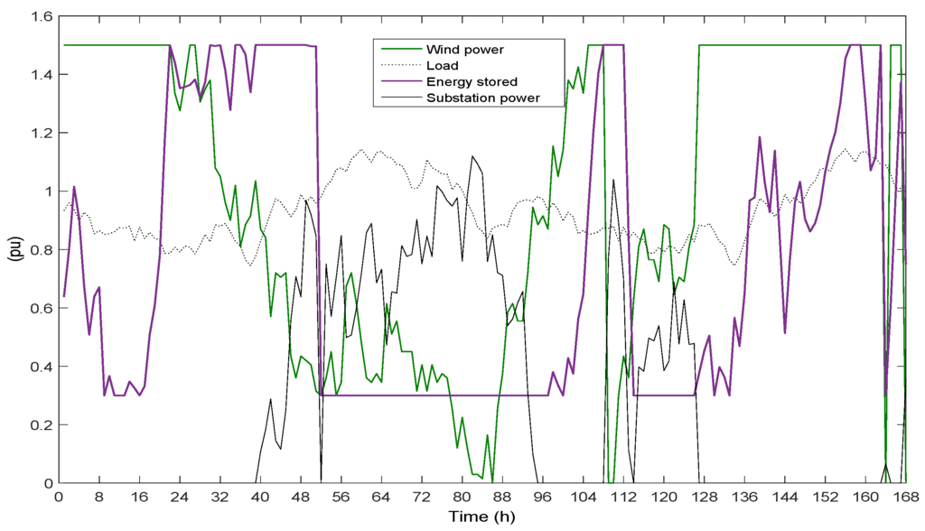 The base power is 1 MVA and the installed power for wind generation can be either 1000 kW or 1500 kW for the different cases. The generic energy storage unit [32] can have different energy capacities: 500 kWh, 1000 kWh, and 1500 kWh, where the maximum storage/production power ranges between 100 kW and 1200 kW. The minimum storage/production power is set to 0. The initial energy level is set to 50% of its capacity. The efficiency rates to store or produce are set to 85%. The costs of production of the storage (discharging) and storage (charging) $0.1/MWh and $0.5/MWh, as in [25,26,28].