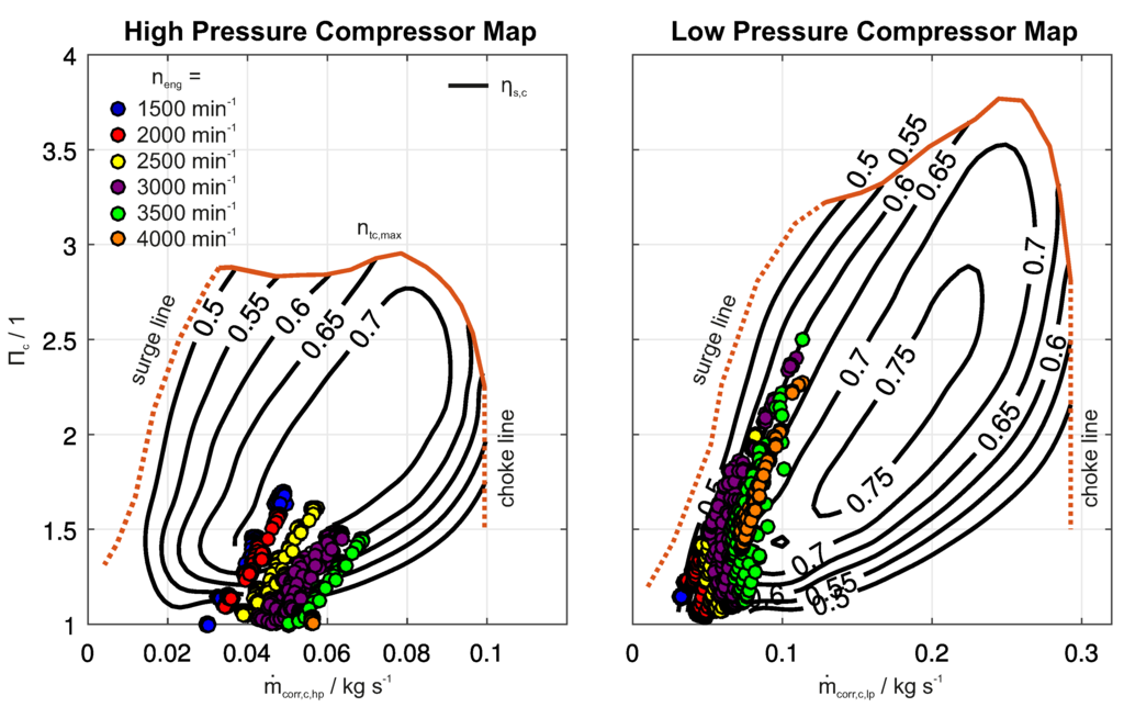 In the following, it is shown that the efficiencies depend significantly on the control strategy. For this purpose, experiments were conducted for evaluating the compressor efficiency at different operating points. The experimental results are shown in Figure 2. Different combinations of wastegate position in the ranges and were applied with the goal to measure the resulting pressure ratio at the compressor of each stage along with the resulting air mass flow. The values are then plotted in the compressor maps given by the manufacturer.