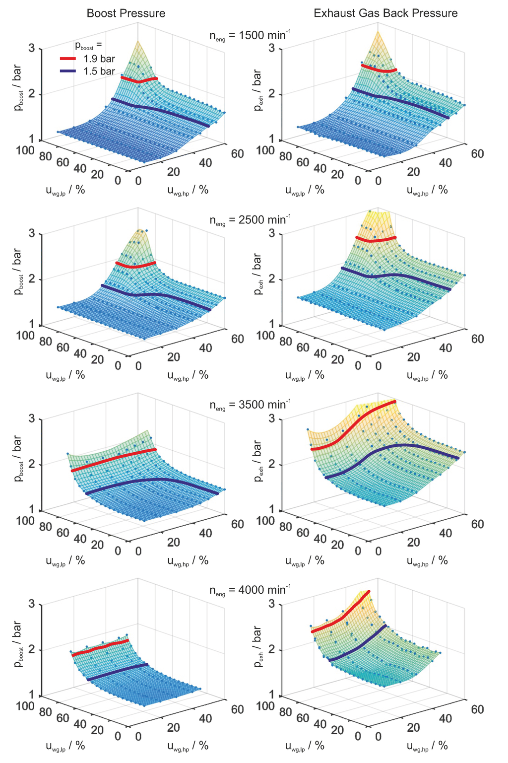 Thus, the pumping losses directly correlate with the difference of boost pressure and exhaust gas back pressure. In Figure 3, the resulting boost pressure and exhaust gas back pressure in dependence of the wastegate positions are shown.