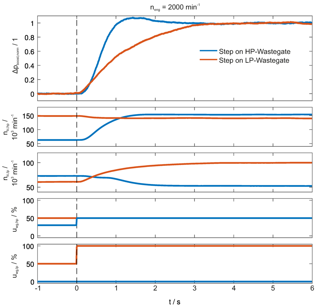 For the experimental analysis, the vehicle dynamometer was run at several constant engine speeds. At these engine speeds, different step inputs were applied on the two wastegates. As a considerable characteristic value, can be used, which describes the time until of the steady state value is reached for the first time. In Figure 4, an exemplary experimental result of the transient behavior of the high and low pressure stage is demonstrated. The plot shows a normalized expression of the boost pressure , the rotational speed of the two turbochargers and the applied wastegate input signals. Each color corresponds to one independent measurement; in both cases, the step is applied at s. When using the low pressure wastegate, the step response shows a characteristic time value of s. In contrast to that, when using the high pressure wastegate, the value can be reduced to s. As long as the high pressure stage is able to deliver torque, it holds true that for the entire investigated operating range, it is beneficial to use the high pressure stage from a transient point of view.