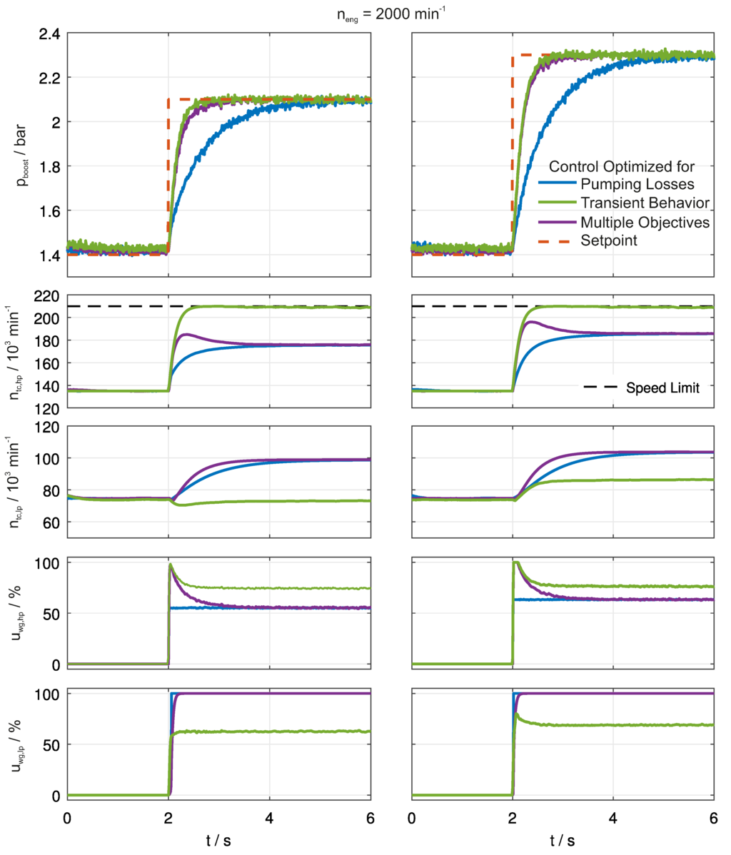In Figure 6, the resulting closed-loop control results are depicted for two step inputs for the reference signal with different step heights. The controller, which reduces pumping losses, entirely relies on the optimal steady state actuation values, which allow tracking the given reference. Moreover, it is the control strategy that uses the low pressure stage in a maximum way. As a consequence, the goal to reduce pumping losses is realized. For the controller, which improves the transient dynamics, the high pressure stage is used as much as possible. The upper limit is restricted by the maximum turbocharger speed. In comparison to the first controller, this strategy reaches the boost pressure setpoint much quicker; however, it uses the low pressure stage less, which results in higher pumping losses. The third strategy is the multi-objective controller. In this case, the actuated values correspond to the ones used by the time-optimal controller during the transient phase. Afterwards, the actuated values fade over towards the optimal steady state values, which are also used by the controller, which reduces the pumping losses. This results in a fast transient response, which is comparable to the time-optimal one. At the same time, the pumping losses are reduced by fading over to the solution with maximum low pressure usage.